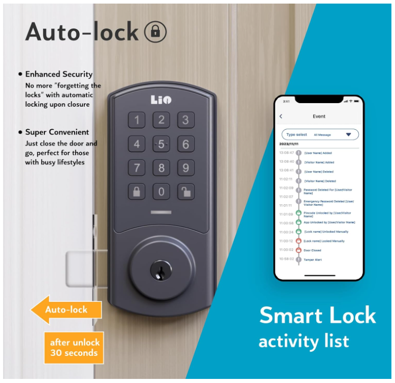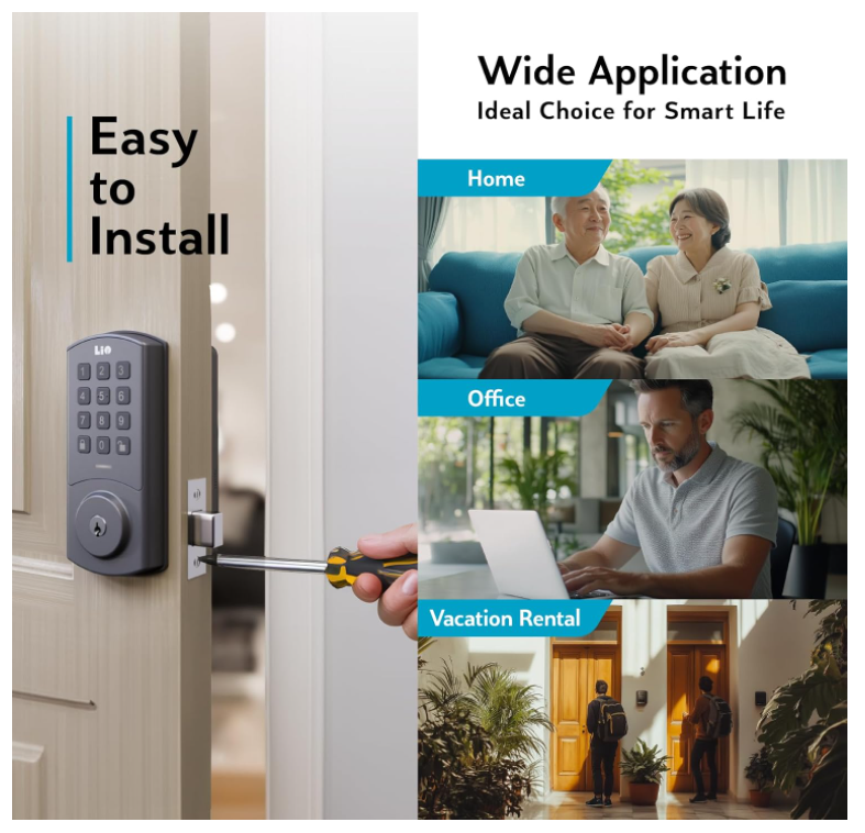 New Keyless Entry Door Lock: Experience a variety of entry options with up to 100 customizable PIN codes, remote control via app, traditional keys, and smart home integration with Amazon Alexa and Google Home. Control Your Locks from Anywhere: Thanks to the included Wi-Fi gateway, the Lio Home Smart Door Lock allows you to use voice commands through Amazon Alexa or Google Home. You can also unlock your door remotely in seconds via the Lio Home app—even while you're away on vacation. Built for High-Security: Crafted from durable materials and ANSI-certified, this lock ensures long-lasting security and reliability, day and night. Flexible Access Codes: The Lio Home app lets you create Permanent, Timed, or One-Time codes, perfect for managing access for family members, visitors, short-term rental guests, or office spaces. Hassle-Free Installation: Installing the Lio Home Smart Lock is quick and easy. With just a Phillips-head screwdriver, you can have it set up in 5–10 minutes—no additional drilling required. Upgrading your front door security has never been simpler.