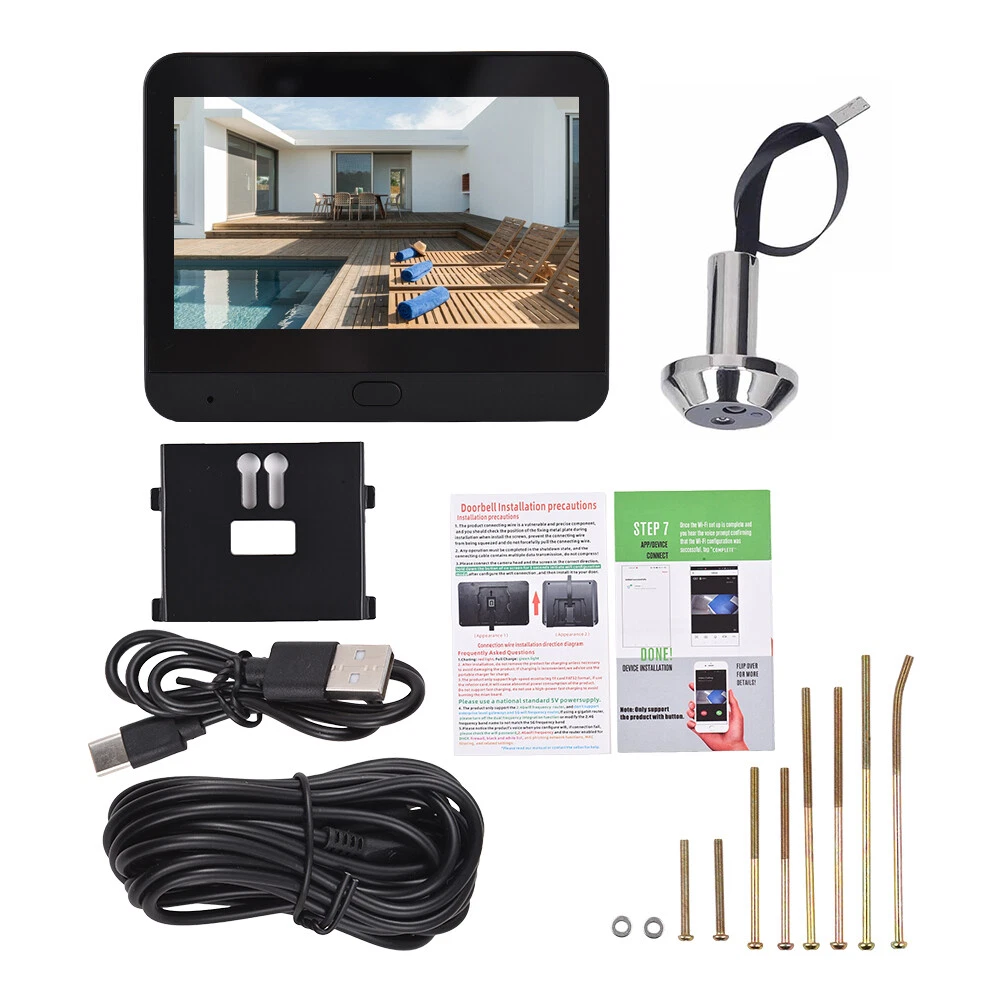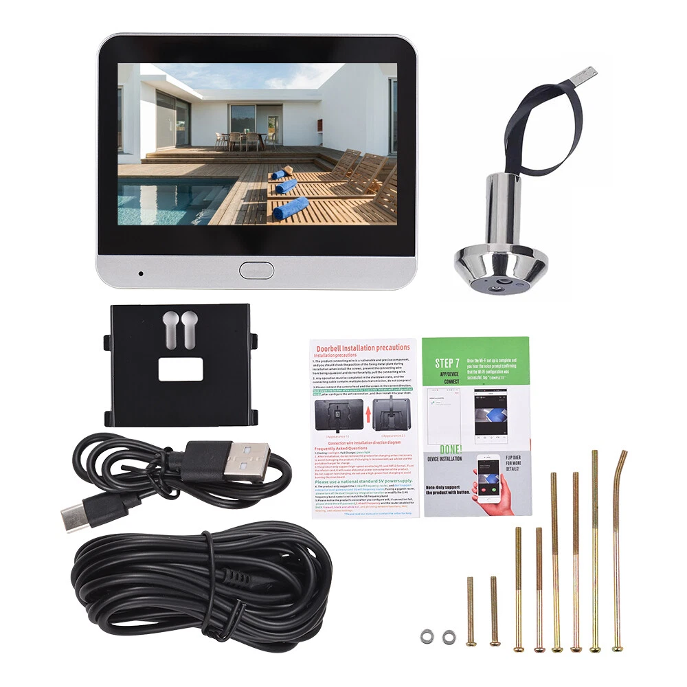 Features: 【High Definition Video Quality】: This smart doorbell camera features a 1080P lens that provides clear and detailed images. The 4.3-inch IPS LCD screen allows you to view your visitors in high definition, ensuring you never miss any details. 【Smart Motion Detection】: Equipped with advanced motion detection technology, this doorbell camera automatically senses and captures movements in its field of view. It sends real-time alerts to your phone via the Tuya APP, allowing you to monitor your home security anytime, anywhere. 【Infrared Night Vision】: Supported by two infrared lights, this doorbell camera provides clear and bright images even in the dark. This ensures your home is protected 24/7, giving you peace of mind even at night. 【Easy Installation and Wide Compatibility】: This doorbell camera is easy to install and fits door holes with a diameter of 14-30mm and door thickness of 35-120mm. It's a versatile security solution that's suitable for most homes. 【Economical and Convenient】: With a built-in 5000Ah battery, this doorbell camera has a standby time of up to 180 days, saving you the cost and hassle of frequent battery replacements. It also comes with a charging cable for easy recharging. Plus, it supports up to 128G memory cards and cloud storage, ensuring you have ample space to store your videos and photos. Specifications: Protocol: Alexa and Home Protocol Operating System: LiteOS Lens Pixel: 1080P Screen Specification: 4.3-inch IPS LCD screen APP: Tuya Battery Capacity: 5000mAh Wide Angle: 120 degrees Language: English/Chinese Support Door Thickness: 35-120mm Suitable Door Hole Ddiameter: 14-30mm Operating Environment Temperature: -20~-55 ° C Color: Black, Silver (optional) Indoor Mainframe Size: 11 * 9 * 2.5cm/4.3 * 3.5 * 1inch Outdoor Camera Size: 4 * 4 * 1.5cm/1.6 * 1.6 * 0.6inch Note: Due to the different display screen and light effect, the actual color of the item might be slightly different from the color showed on the pictures. Packing List: 1 x Indoor Mainframe 1 x Outdoor Peephole Camera 1 x Metal Hanging Plate 1 x Type-C Charging Cable 1 x Screw Pack 1 x Instructions
