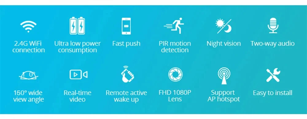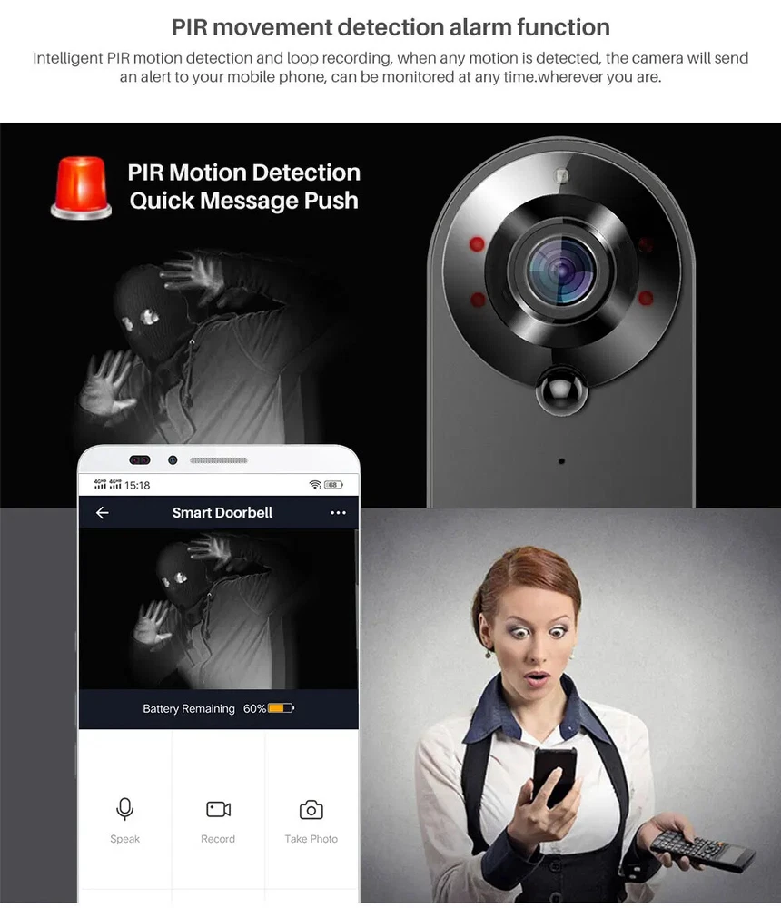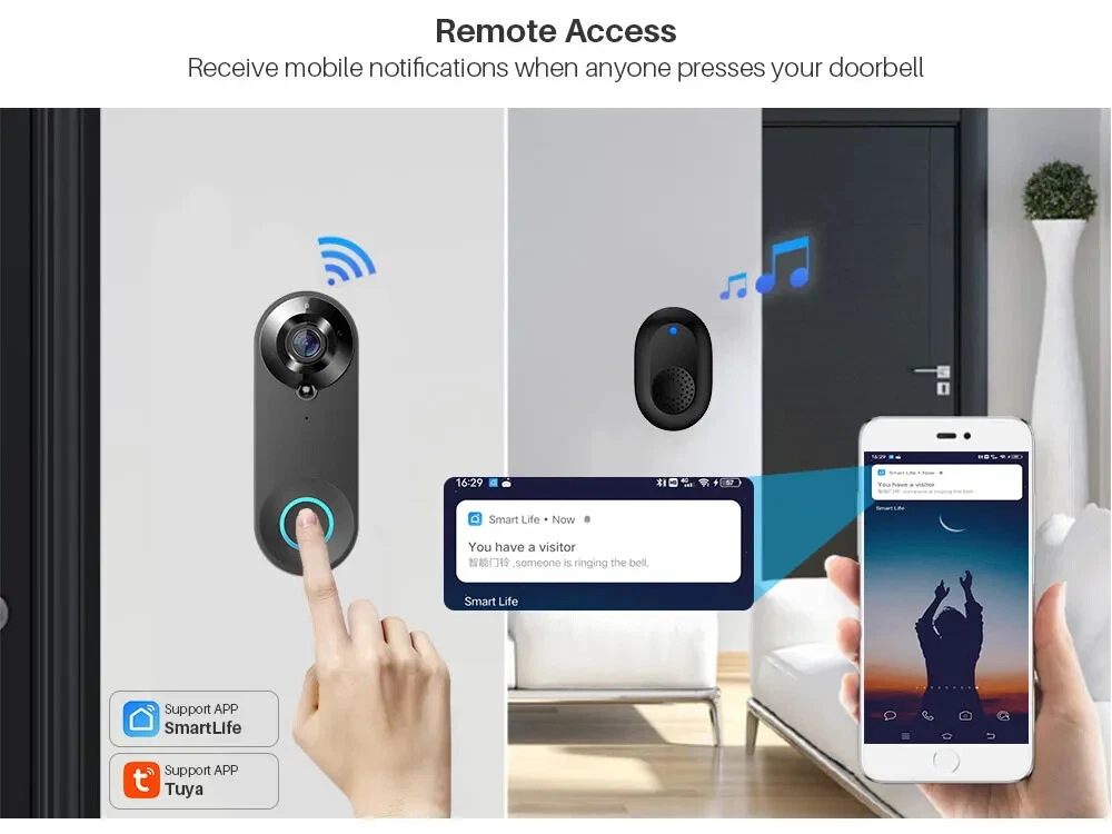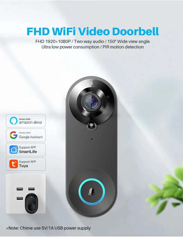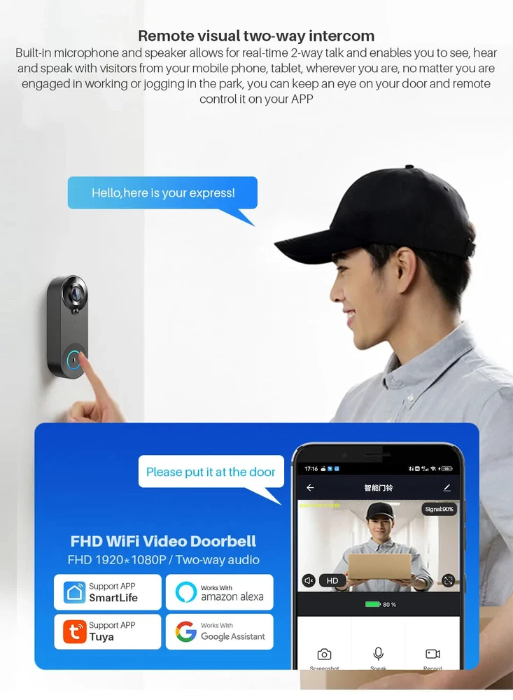 Tuya 1080P Smart WiFi Video Doorbell Feature(Full-featured version) ●Low power smart WiFi video Doorbell ●2.0 Megapixel,150° wide viewing angle ● Support PIR motion detection,alarm push to mobile phone ● Support 2.4G Wi-Fi connection ● Support mobile phone& button & PIR detection wake up ● High Quality two-way intercom with noise cancellation ● Support Micro SD card up to 64GB ● Low consumption 2*18650 Lithium battery(4400mAh-Built-in battery) ● Maintain 30 days under 15s awoke everytime, 10 times every day Support APP 1.Tuya APP; 2.SmartLife APP; Note:Compatible with Google Assistant or Amazon Echo Show Sensor device 1080P COMS sensor - GC1054 Audio 1.Two-way voice; 2.Built-in speaker; 3.Built-in Microphone; View Angle 1.150 degree Horizontal Day & Night 1.IR-CUT double filter automatically switches; 2.6pcs infrared LED 850mm; 3.Min Illumination:1 Lux; Connection 1.Support WiFi 2.4 GHz, IEEE 802.11 b\g\n; 2.AP Hot spot; 3.Scan QR code;StorageSupport SD card 8G / 16G / 32G/ 64G Recording 1.Support smart phone local record, records video playback; 2.Optional recording time setting between 15s-45s, once doorbell triggered; Working Condition 1.Press Button Directly; 2.PIR detection triggered; 3.Mobile phone Control; Motion Detection 1.PIR motion detection, sensitivity High/ Medium/ Low/Off; Scene Mode 1.Backlight compensation; 2.Infrared night vision; 3.Quick movement; 4.HLC; 5.D-WDR; Share 1.Support QR code share(one-click generates QR-code, share to others To add your doorbell devices, join in remote control. Maximum supports 7 authenticated users, supports users 3 view at the same time; Battery 4400mAh-Built-in battery (Micro-USB Charing) FHD WiFi Video Doorbell FHD 1920*1080P / Two-way audio / 150° Wide view angle Ultra low power consumption / PIR motion detection Voice Control Compatible with Google Assistant,Alexa Echo Show for voice control and real time monitoring. Free your hands Only need this wifi doorbell can help you solve these problems Tuya Smart 1080P Full HD video doorbell with enhanced features that let you see, hear, and speak to anyone from your phone Remote Access Receive mobile notifications when anyone presses your doorbell Wider viewing angle and clearer pixels 150-degree viewing angle and 1080P pixels, allowing you to see wider and clearer. Remote visual two-way intercom Built-in microphone and speaker allows for real-time 2-way talk and enables you to see, hear and speak with visitors from your mobile phone, tablet, wherever you are, no matter you are engaged in working or jogging in the park, you can keep an eye on your door and remote control it on your APP View the video in real time You can check the situation at your door anytime and anywhere through the mobile APP. PIR movement detection alarm function Intelligent PIR motion detection and loop recording, when any motion is detected, the camera will send an alert to your mobile phone, can be monitored at any time.wherever you are. Night Vision and Motion Detection With 4 sensitive infrared lights, protect your home 24/7. Day and night mode automatic switching Video Playback, Video Storage Built-in TF card slot, can support 8-64G memory card, can view the video at any time, automatically overwrite the oldest video when the memory card is full. One charge,long battery life Built-in 4400mAh lithium battery,strong endurance, low power consumption, more energy saving Standby time:About 1 months (Wake up 10 times a day, 15S each time) Micro-USB Charing In the case of no electricity, the doorbell can be charged with a power bank, Android mobile phone reverse charging function, through the Micro-USB date cable