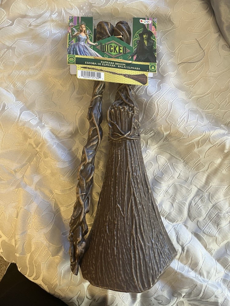 The Wicked Elphaba's Broom is a fantasy-themed roleplay toy suitable for children aged 5 years and up. Manufactured by Disguise, it features an unflagged bristle design and compact, portable styling. Perfect for imaginative play on hard floors, this toy's dimensions of 3.15"W x 3.15"H make it easy to maneuver and carry around. With a special feature of being compact and portable, this product is a fun and stylish addition to any child's dress-up or pretend play repertoire.