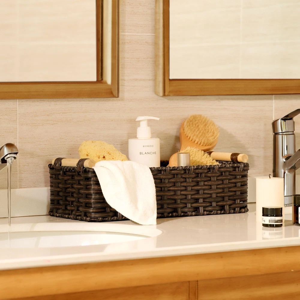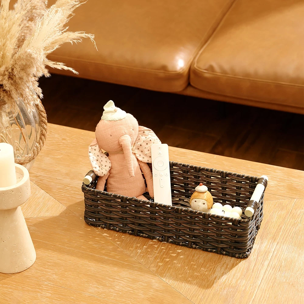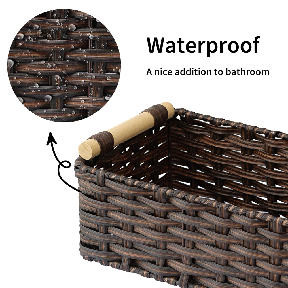 Durable Structure: Made from durable and ordless material tightly woven on a lacquered metal frame, this rectangle basket is built to last, ensuring its resistance to deformation and fading. Multifunctional Storage: The wicker storage basket crafted with washable material is great for bathroom storage of toilet papers,candles, towels, lotions, or sprays in the back of toilet and on shelves, the vanity, and the toilet tank top. Sturdy Side Handles: The wicker basket with handles is designed for easy carry, making it a versatile storage solution for bathrooms, bedrooms, living rooms, and offices. Elegance in Design: Featuring a stylish and modern exterior, the woven basket organizer serves as not only a practical storage solution but also decorative baskets for home decor, enhancing the ambiance of your space. Proper Capacity: Measuring 14¼" x 6½" x 4¼" (L x W x H), the shelf basket offers a large enough capacity for home organization. Size may vary by 1/2 inch difference due to handmade