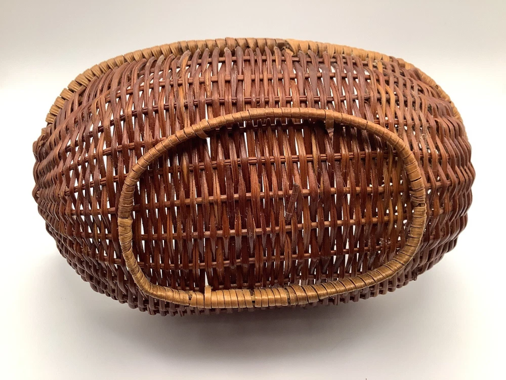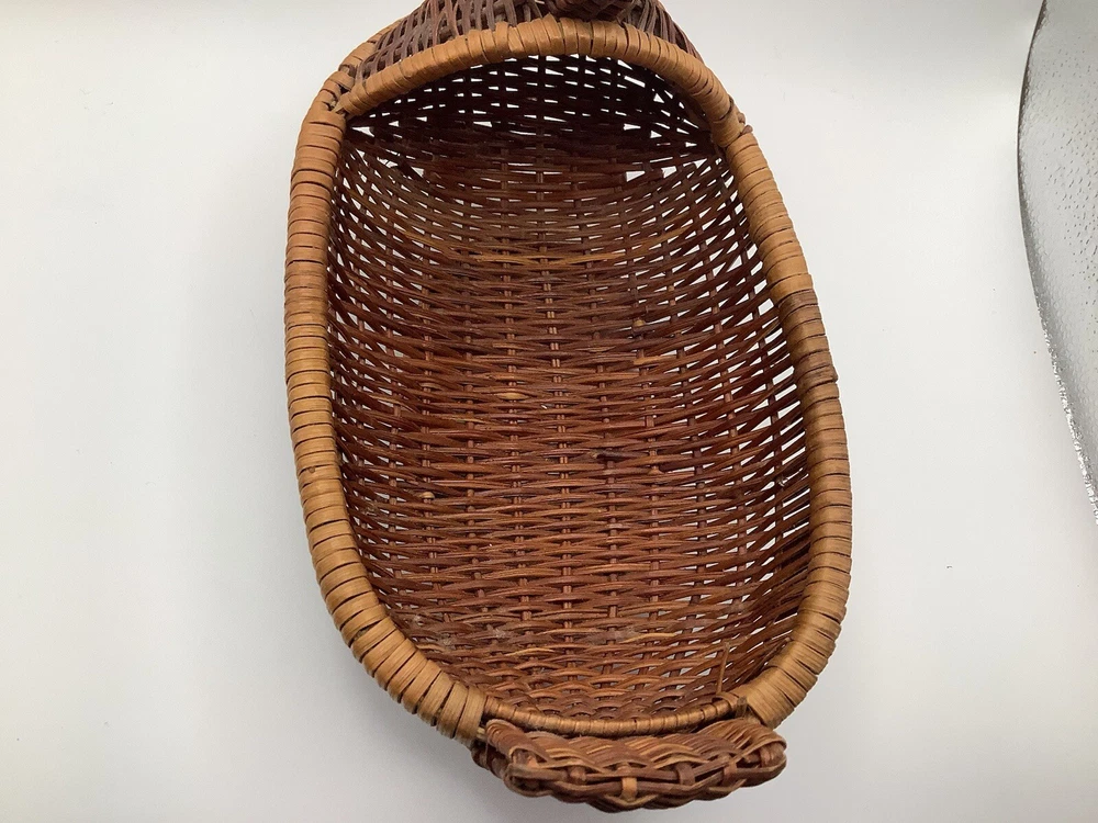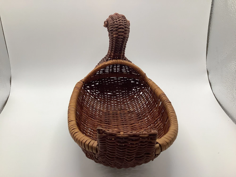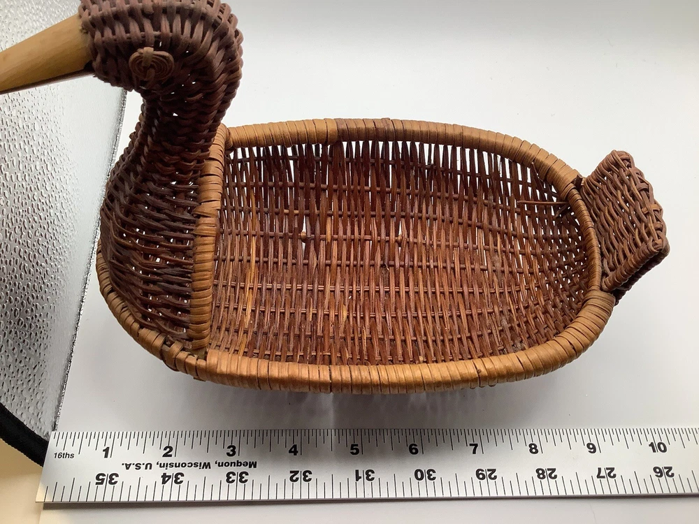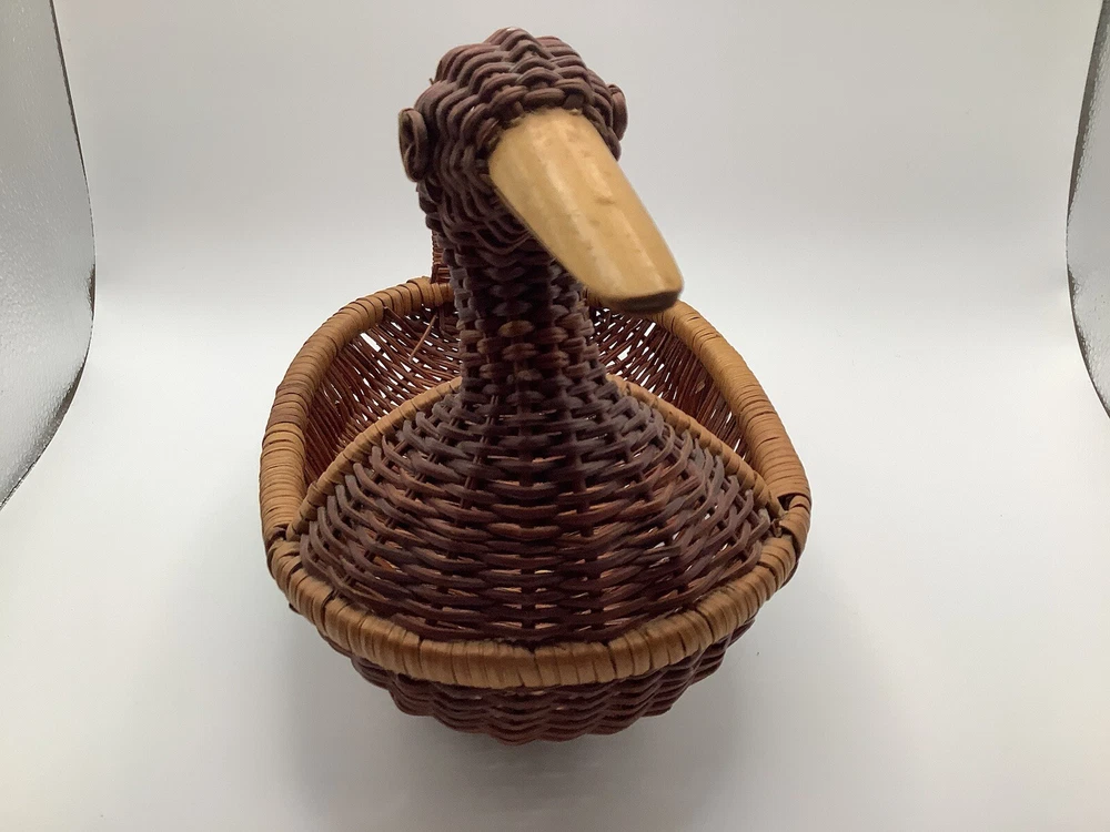 This vintage wicker duck basket features an oval shape with a bamboo wood beak, adding a charming touch to any farmhouse or country-themed decor. The duck character design is accented by a stained finish, giving it a rustic look. Perfect for collectors of decorative items, this miniature wicker basket is a unique and whimsical addition to any home.