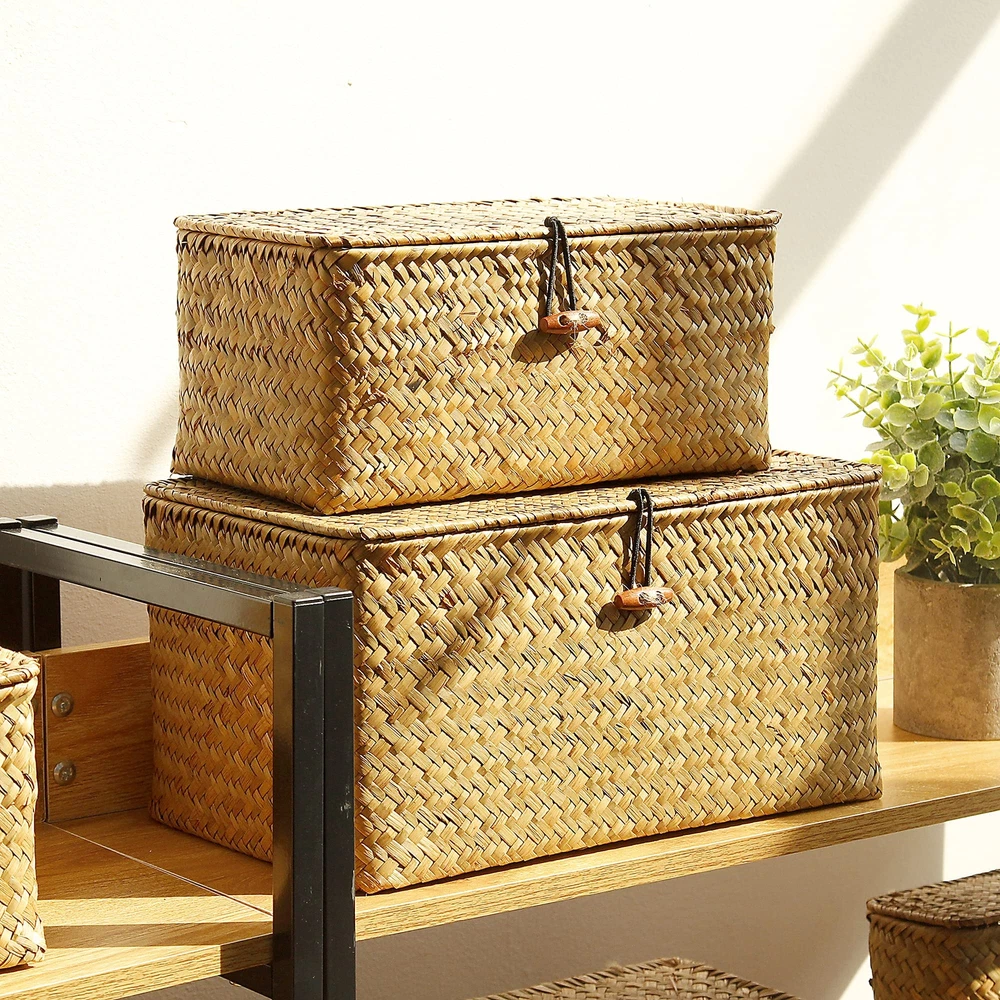 Set of 3 Wicker Basket - Multiple sizes are combined to meet daily storage needs.Large baksets:14.2"x9.4"x7.3", Medium Baskets:12.2"x7.1"5.9",Small Baskets:10.2"x5.5"x4.3" Premium Material - Woven storage basket is made of 100% natural wicker and metal frame with a light grass scent, perfect for storing nightstands. Storage basket with lid is closed by a buckle, which is dust-proof and prevents naughty babies or pets from opening the box, so that the items have a safe storage environment. Wicker baskets with lids add a boho style to home decor and are perfect for bathrooms, bedrooms, kitchens, living rooms and more. It is not only a stunning decorative boxes, but also a versatile storage boxes with a lock. Decorative Storage Bins are great for organizing Kids Toys, Snacks, Books, Make up and Hair Accessories and other small things.It can be displayed anywhere you want without taking up too much space.