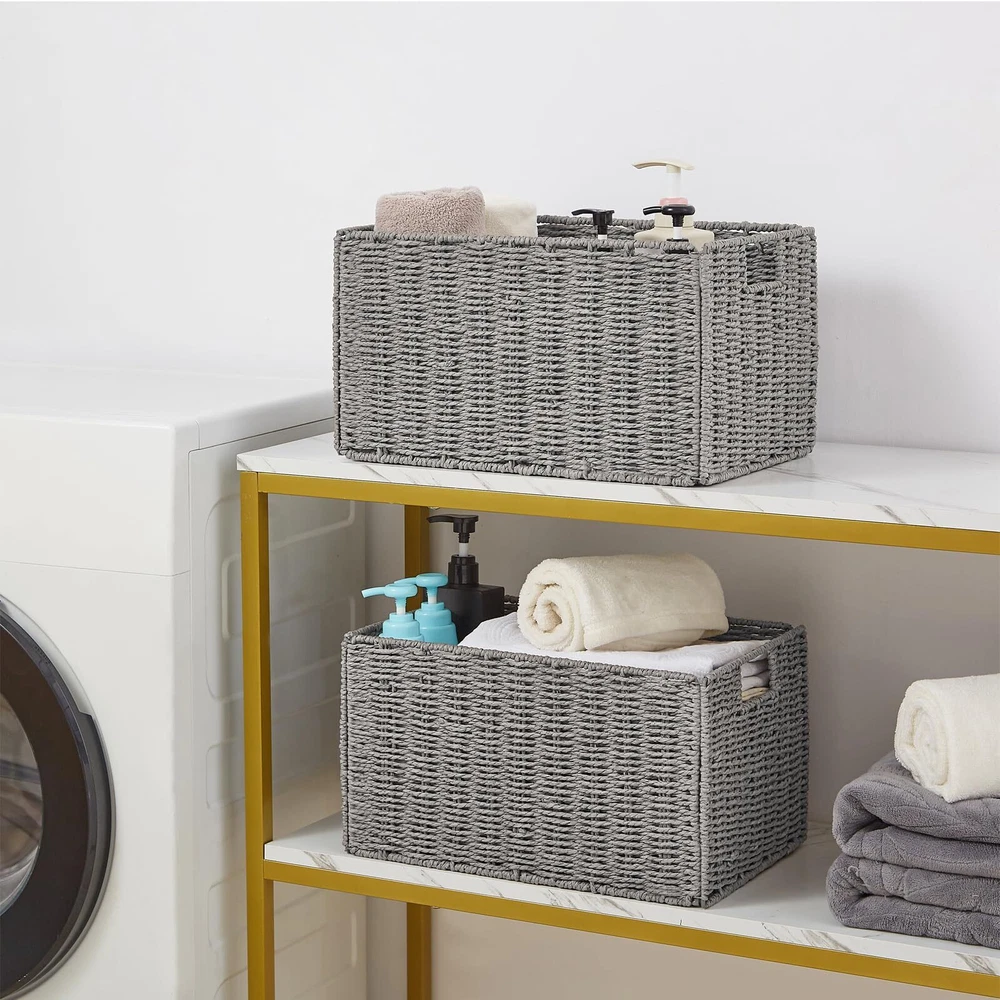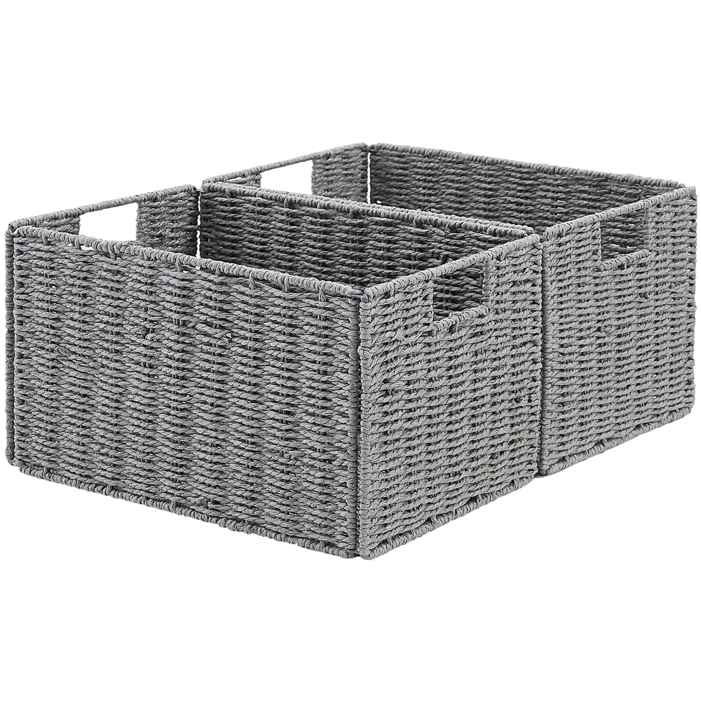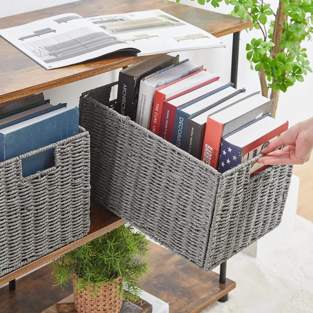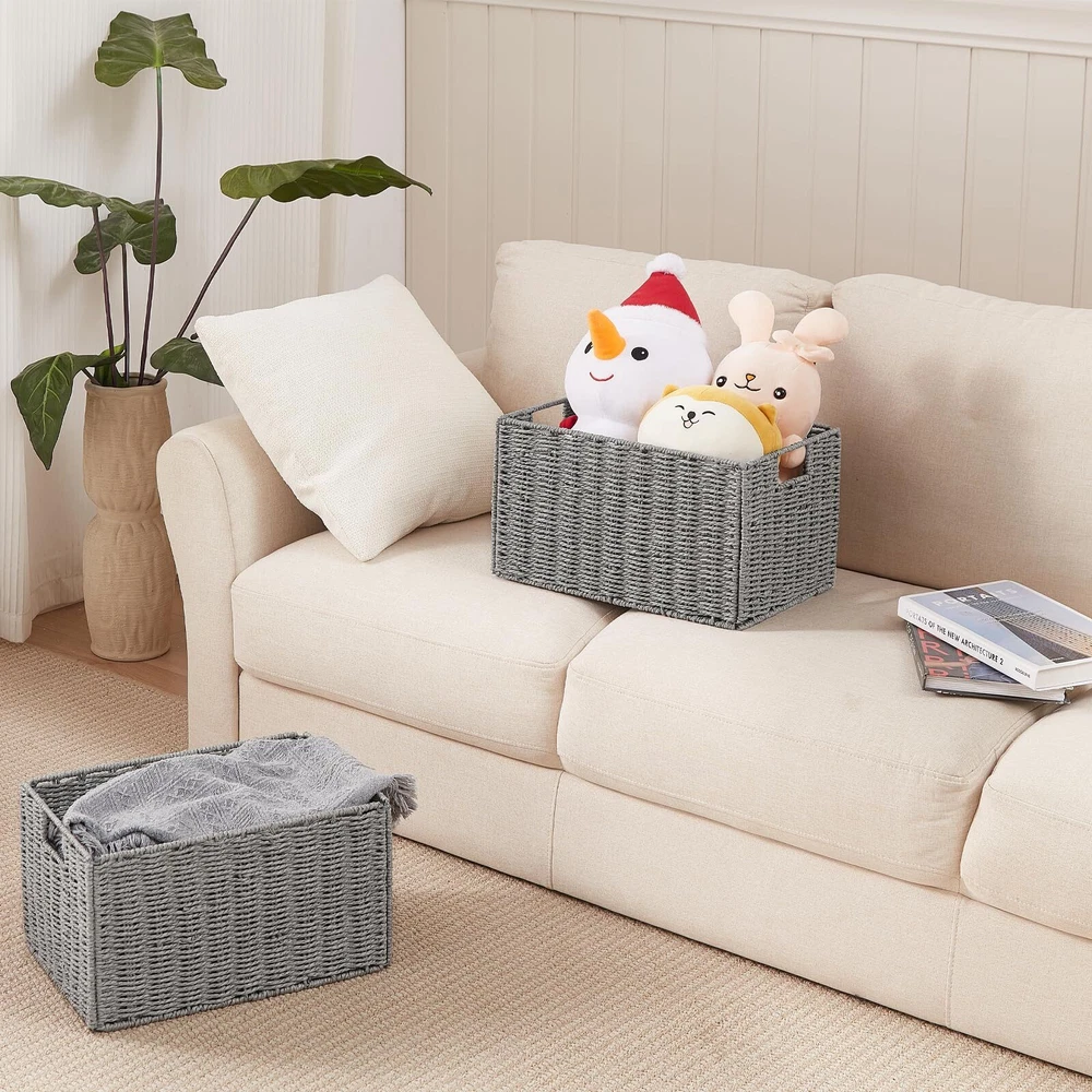 Dimensions: The storage basket measures 15.2''L x10''W x 8.6''H large baskets for storage. Size may vary within 1/4 inch due to handwoven design and manual measurement. Eco-firendly & Sturdy: 100% renewable round paper rope. Wicker baskets are woven from paper over a steel frame and the material is hazard-free. These small baskets for organizing are all handmade with natural paper custom. Collapsible Basket: You can fold the grey basket completely flat and stack them up against each other to save space when not in use. Versatile & Functional: These large storage wicker baskets can be used in your bathroom, living room, kitchen, office, pantry countertop toilet storage baskets, etc. Portable Storage Bins: Basket organizer feature easy-carry integrated handles. Versatile little rattan baskets for topper paper, keys, drinks, canned foods, snacks, hand towels, toiletries, toys, and purses. Buying with Confidence: We provide refunds and returns if there are any problems after receiving these large rectangular storage baskets for organizing.