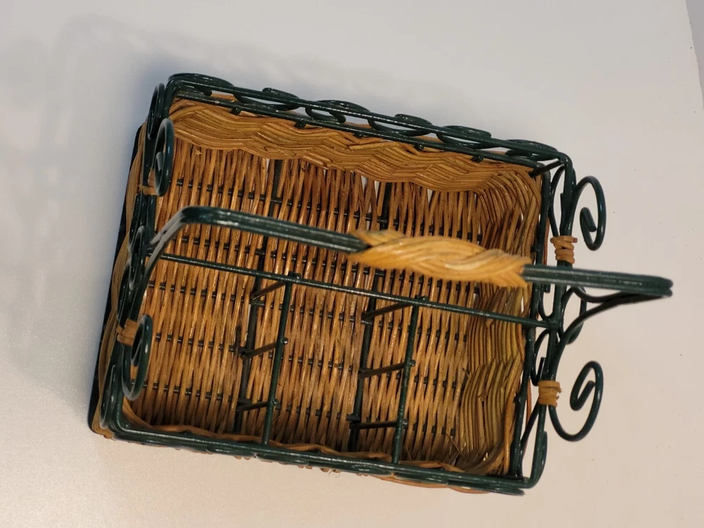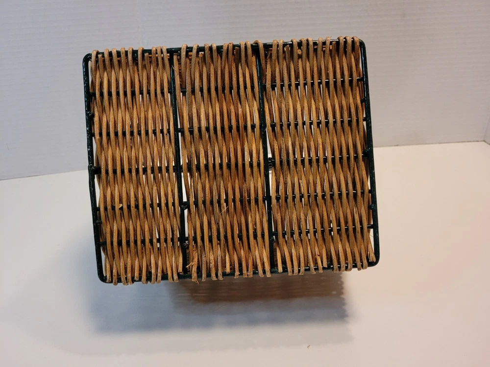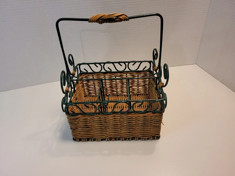 Type: Caddy Item Depth: 5" Country/Region of Manufacture: Unknown Style: Farmhouse, Country Features: Multipurpose Number of Compartments: 4 Color: Tan & Green Item Height: 10" Item Width: 12 in Material: Wicker Model: Napkin & Silverware Caddy Brand: Unbranded