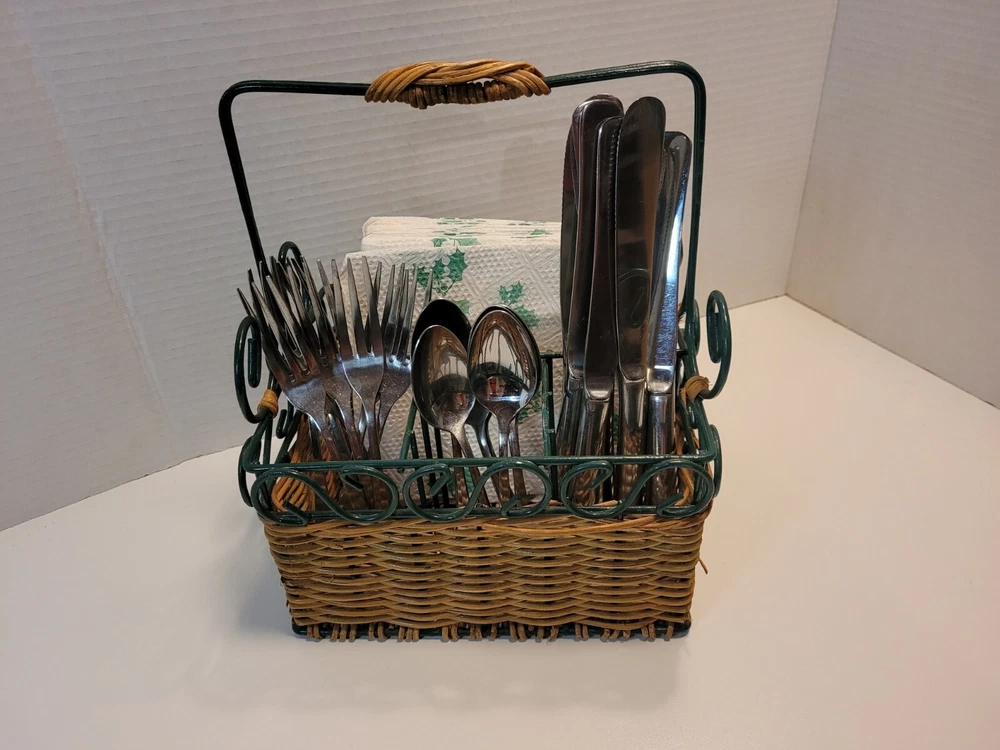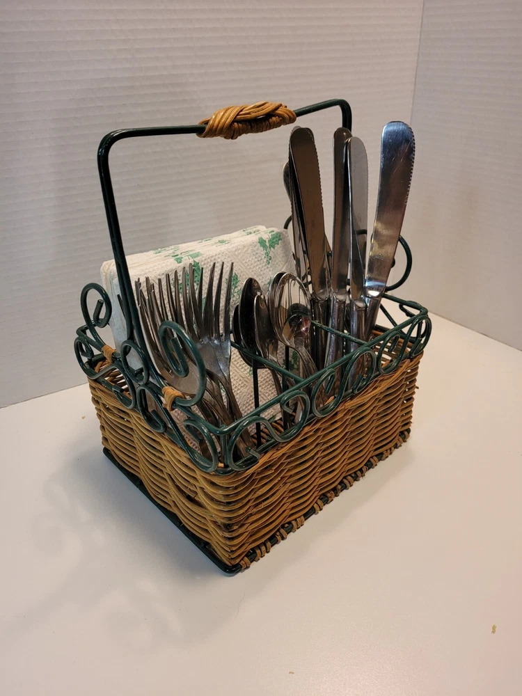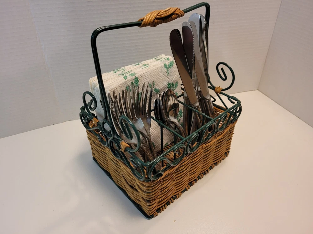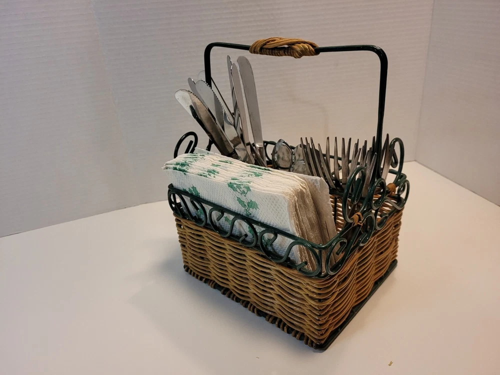 Wicker & Wire Basket for Flatware and Napkins. Silverware Caddy Utensil Organizer. With a handle for carrying, making buffets and picnic dining easy. Please see the photos as they are part of the description. Flatware and napkins are not included. All measurements are approximate. 452g02s2