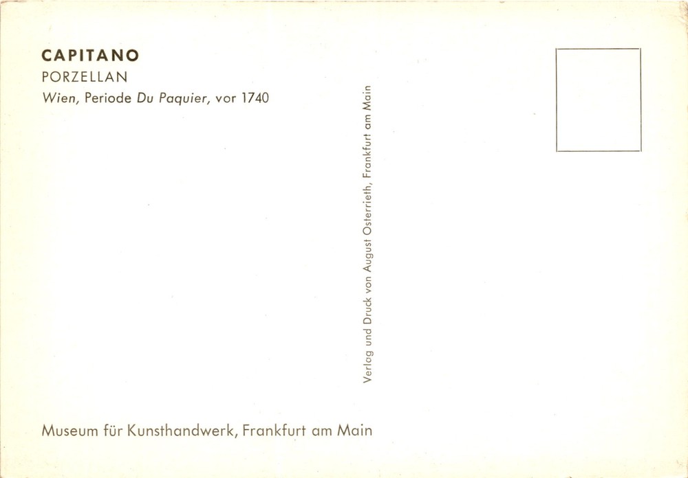 MAKE AN OFFER. THE MORE YOU BUY THE BETTER DEAL I WILL ACCEPT The postcard features a porcelain figurine named Capitano from Vienna, dating back to the Du Paquier period before 1740. This figurine is part of the collection at the Museum für Kunsthandwerk in Frankfurt am Main. The postcard was published and printed by August Osterrieth in Frankfurt am Main.