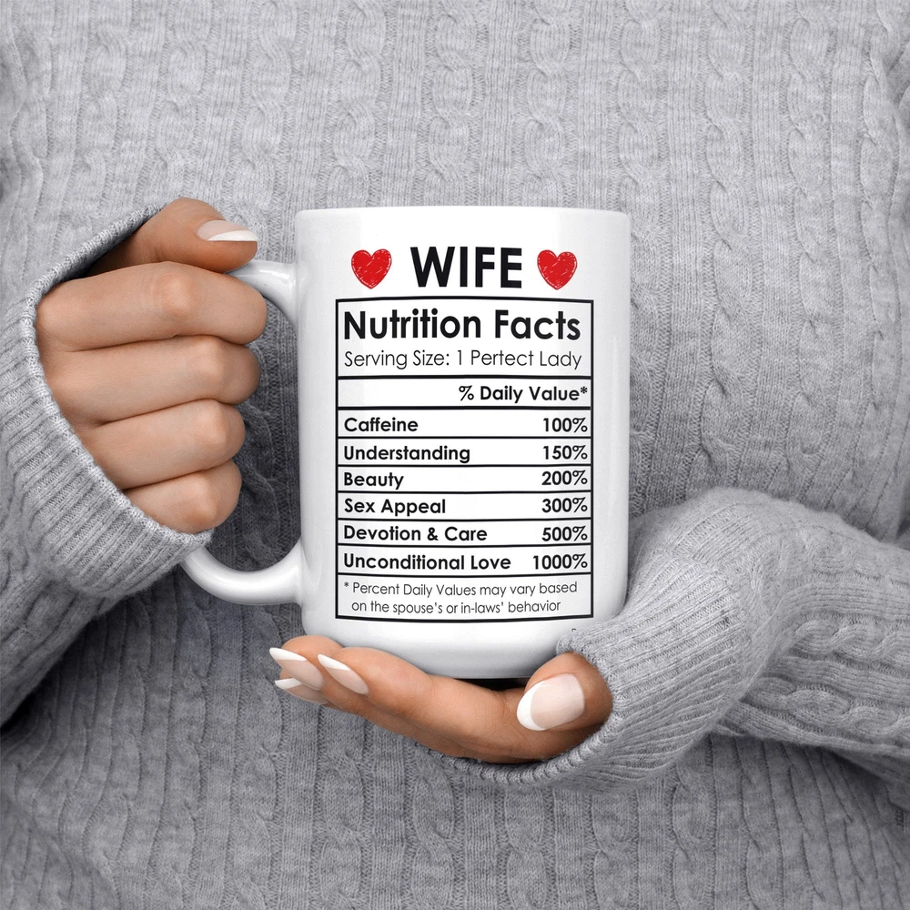 Wife Nutrition Facts Valentine Gift From Husband Family Anniversary Coffee Mug Product Details.. This high quality 11oz. ceramic white mug has a premium hard coat that provides crisp and vibrant color reproduction sure to last for years. Perfect for all hot & cold beverages. The highest quality printing possible is used. It will never fade no matter how many times you wash it. Material: 100% Ceramic. Print both sides. Dishwasher and Microwave Safe. High Gloss + Premium White Finish. Printed in the U.S.A. Personalized & Custom. We support personalized and custom mug to add custom, when placing an order, you can add notes to the "order note" in shipping address section. Also you can contact us directly via message. Shipping Info. Ready to ship in 1 to 2 business days, All products are made-to-order and proudly printed in the United States. Shipped by USPS and DHL, You will receive your order in 5-7 days. Replace & Refund. All products are defective during shipping broken, chipped will be replaced free of charge. You are not satisfied with the product, we will refund 100% money to you. If any other issues arise, please do not hesitate to message, we would be more than happy to assist you.