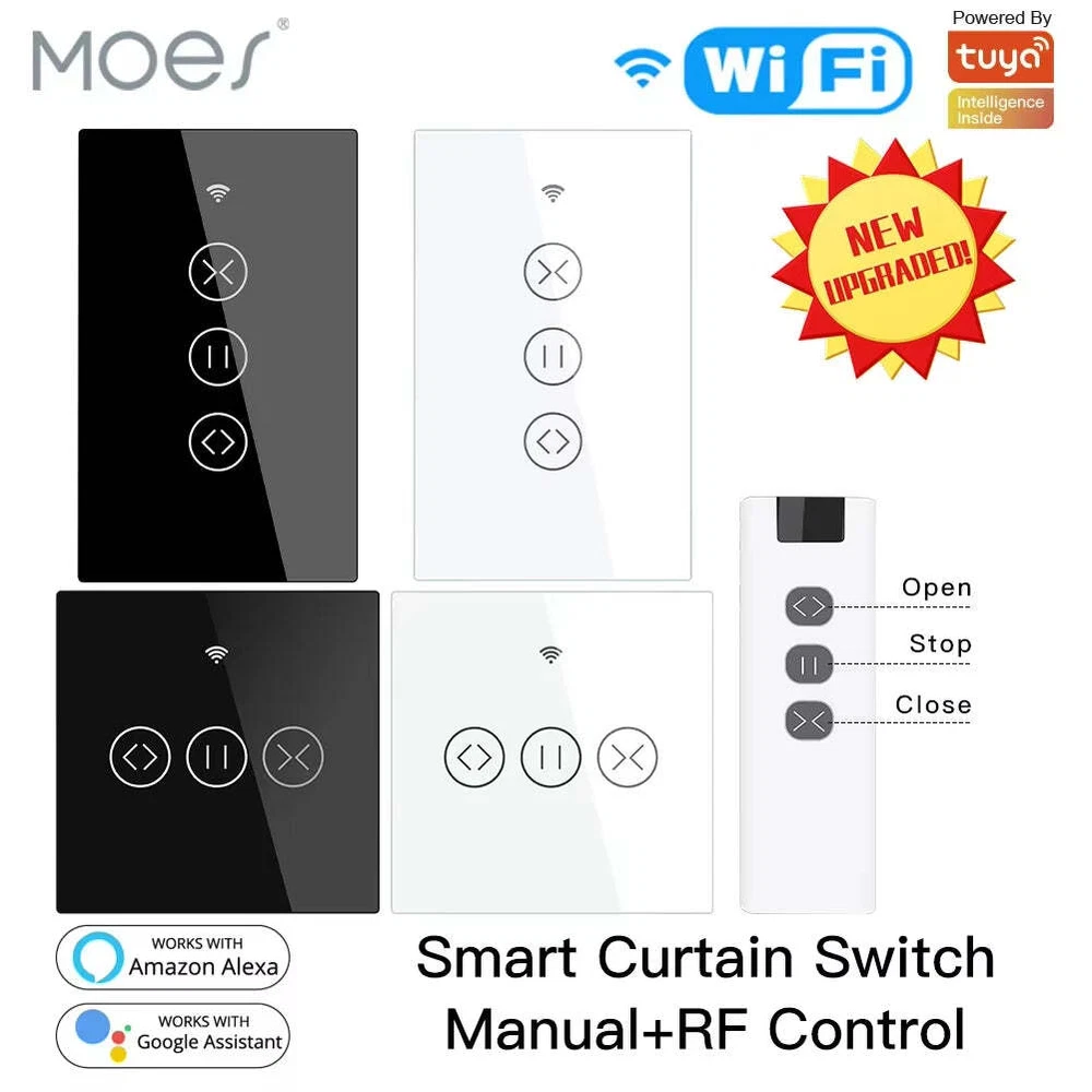 New Products! New WIFI 2.5D smart curtain switch(Exclusive discount) WiFi RF433 Smart Touch Panel Curtain Blinds Roller Shutter Switch(2/3 Way) Multi-Control Tuya Smart Life App Relay Status and Backlight Switch Wireless MHz433 Remote Control Motorized Curtain Motor Needed,Works with Alexa Echo Google Home By Moes 2020 New Arrival Upgraded with More Personalized Points: Update1: Multi-control in a much easier way Update2: New pairing mode with WiFi+Bluetooth Update3: Backlight ON/OFF optional Provide much more convenience and updates for your smart lifestyle with the price unchanged as before. Product Features: 1.Easily transform your house into a smart one with the new powerful functional smart curtain switch;2/3-way multi-control association to control 1 roller blinds,shutter curtain with multiple curtain switches;Intelligently control our roller blinds,shutter curtains in a much easier way with multiple controlling modes;RF remote and manual control your curtains optional and available meanwhile with RF frequency built in,so as group control multiple switches with one Remote switch;achieve multi-control by associating to other smart switches;can work with smart curtain motor for roller shutter/blinds to realize automation for all curtains at home;add motorized shades or other similar devices to your smart home with Smart Curtain Motor! (Note:the curtain motor is not included in the package,you need a self-purchase of it;RF remote control switch is included in the package.) 2.Remotely control devices with your smart phone via Smart Life and Tuya App wherever you are;Compatible with Amazon Alexa and Google Home allows for hands-free voice control. 3.Reinsert new features into upgraded Smart Life Tuya App backlight switch setting also,providing much more humanized intelligent operation design for your smart lifestyle;share control with family and friends for added convenience. 4.Match different kinds of curtains such as window blinds/roller blinds/Venetian blinds /roller shutter.Install the Smart Curtain Switch in a lot of places,like office/study/bedroom/ living room etc.,even control the Awning in your yard. 5.Take full control of connected appliances with timers, schedules and countdown (1/5/30 mins, 1 hour, Monday to Sunday ,etc.) with the app;A much easier pairing mode for adding the device with WiFi and Bluetooth connected;includes full 2-year warranty and 60-day refund guarantee for complete satisfaction. ATTENTION:The RF Remote Control Switch Can Only Work with the RF+WiFi Curtain Switch. Main Specifications: Curtain Switch: Working Voltage:AC 100-240V 50/60Hz Load Power≤600W Current:2.5A Standby Power:≤0.5W Working Temperature:0-80℃ WiFi Protocol:IEEE 802.11 b/g/n Connection Mode:Zero Line ,Fire Line RF Remote: Frequency:433 MHz Standard Code:1527 Wireless Communication:RF Battery Required*1