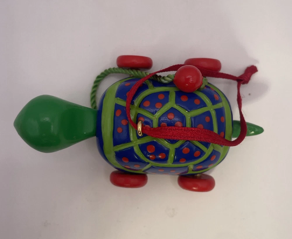 This Hallmark Keepsake Ornament is a must-have for any fan of The Wiggles. It features a cute and cuddly green turtle, made of wood and crafted with care in 2001. The turtle is an original, licensed reproduction and is sure to bring joy to anyone who sees it. Add this charming ornament to your collection today! No box.