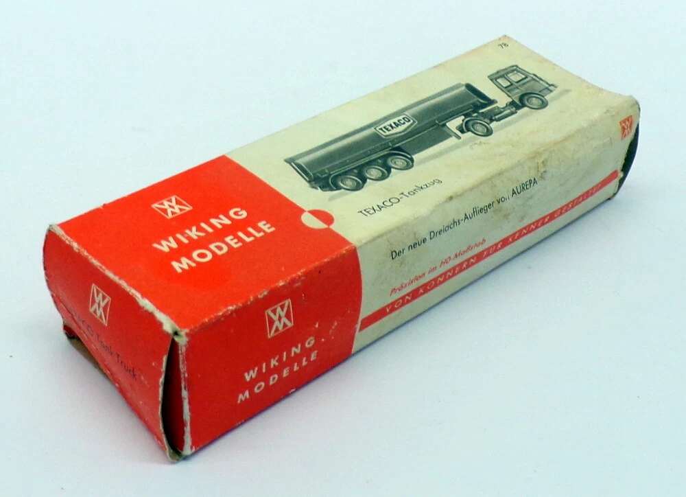Wiking Modelle HO 1/87 Scale 78 - MAN Tanker Truck - Texaco Contact Us Home About Us Feedback Contact Us Add to favourites Wiking Modelle HO 1/87 Scale 78 - MAN Tanker Truck - Texaco click thumbnails above to enlarge Shop Home Our Feedback Ask a Question Product Description 1/87 Scale Plastic Model by Wiking Modelle The MODEL Is In GOOD Condition - previously displayed. (please study images &; check grading list)The BOX Is In FAIR Condition - very worn. SEE IMAGES FOR BEST DESCRIPTION. Product Details Scale 1/87 Material Plastic Brand Wiking Modelle EAN 7625942234226 Additional Info GRADING CONDITIONS MINT - The item is in perfect condition. NEAR MINT - Almost perfect, any imperfections will be extremely minor. EXCELLENT - The item will have had very careful use, with only small imperfections. GOOD - The item will have had more use, showing obvious imperfections. FAIR - The item will have heavy signs of wear, showing major imperfections. SPARES or REPAIR - The item will be in a poor condition. Payment Shipping Returns About Us Methods of Payment Our preferred method of payment is Paypal. Any questions please ask! Thanks. WORLDWIDE MAIL-ORDER SPECIALISTS Shipping within the UK is FREE OF CHARGE - Plese see the eBay postage tab for other worldwide shipping charges. We ship from our warehouse is the UK. We ship worldwide everyday using a Tracked / Signed For service. Over 30 years of experience shipping collectible models worldwide - you can trust our service. Any questions, please ask. Thanks for looking ! Returns We hope you are completely satisfied with your purchase. In the unlikely event that there is a problem / fault with the item we will happily provide you with a refund (excluding returns postage). About Us R.M.Toys Ltd is a family led company with over 50 years worth of experience specialising in high quality collectable models & worldwide delivery. We have continued to expand and develop as the retail market and technology has evolved and we are in no doubt we will need to continue with that trend so we hope we have been able to showcase our service and provide you, our customer, with everything you have required. Our aim is to ensure no matter what the model, we will provide an excellent service experience. To us, this means great availability, excellent customer service as well as quick & secure delivery, to anywhere across the world. All that is left to say is Thank You for taking the time to read our page and using our company to assist with your collection and gift needs - every order placed is gratefully received and as important to us as the next. Kind Regards The RM Toys Team R.M.Toys Ltd - All Rights Reserved || Design by Tapika Store The MODEL Is In GOOD Condition - previously displayed. (please study images &; check grading list)The BOX Is In FAIR Condition - very worn. SEE IMAGES FOR BEST DESCRIPTION.