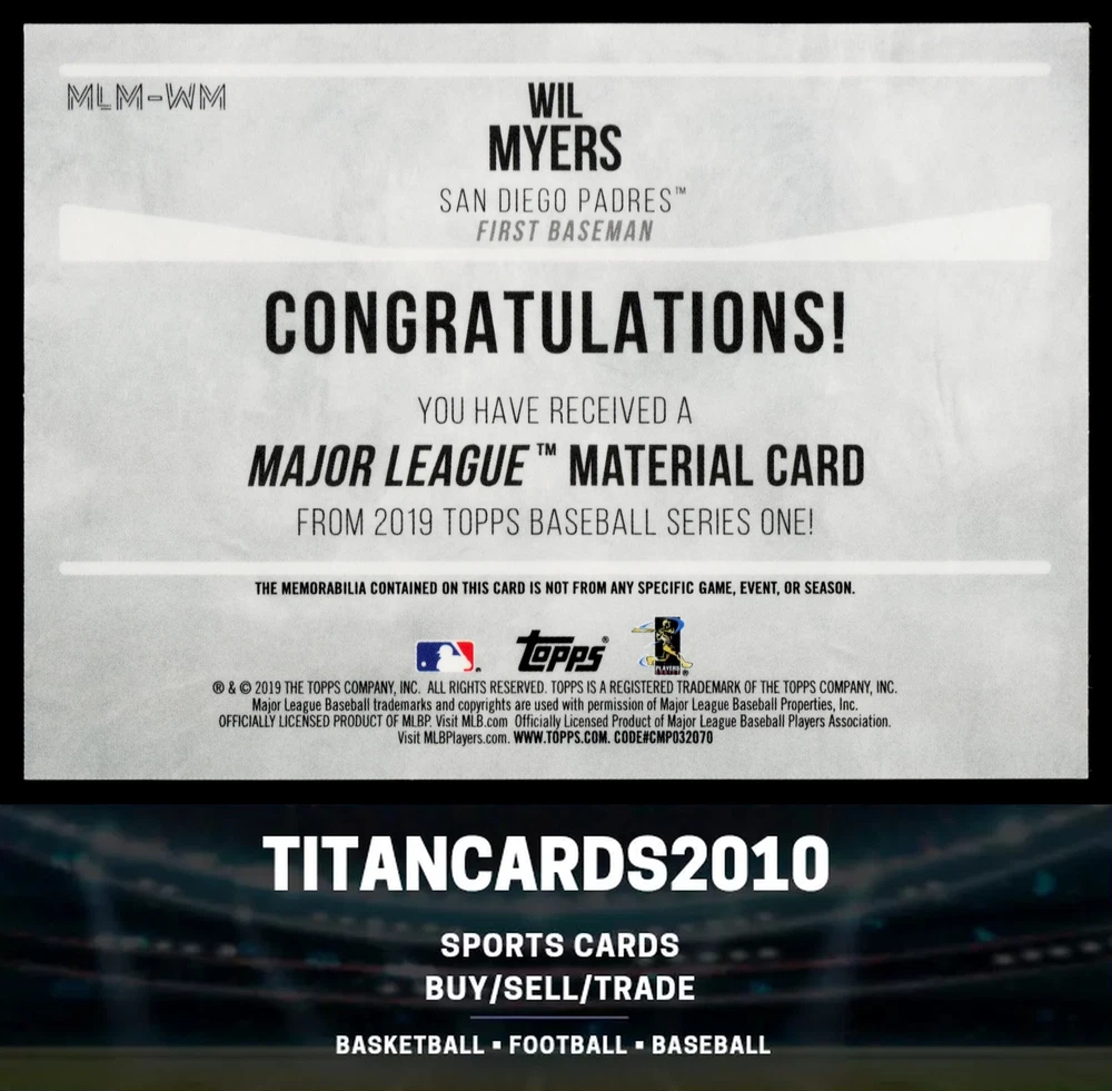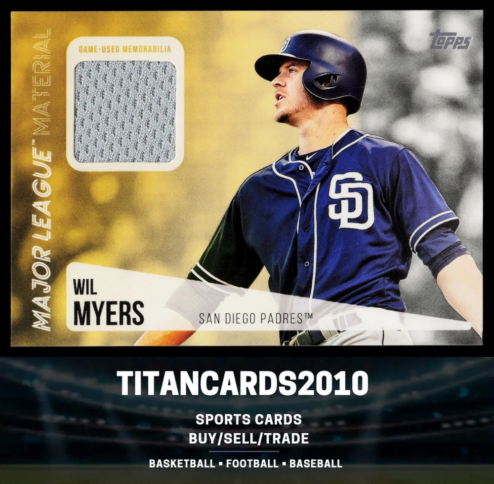 You will receive a Near Mint or Better, Wil Myers, 2019 Topps, Major League Material Relics, MLM-WM San Diego Padres card PLEASE NOTE: SOME CARDS THAT GO THROUGH OUR SCANNER MAY APPEAR TO HAVE LINES THROUGH THEM. THEY ARE NOT ACTUAL SCRATCHES, SIMPLY FALSE IMAGE LINES. WE WILL NOT INTENTIALLY SELL, DAMAGED CARDS. NEW CARDS LISTED DAILY ORDERS SHIP NEXT DA Y (Weekends as mail service is available) VISIT OUR STORE FOR MORE DEALS! USE THE SEARCH ICON IN THE STORE TO FIND YOUR FAVORITE TEAMS & PLAYERS! Be sure to save us as sellers to be the first to be notified when new and exciting cards are posted! Please note, we are not professional graders, and the condition of the card you purchased is highly subjective. Please refer to the high quality scans of the card you are viewing, and determine the condition of the card for yourself. Feel free to reach out with questions! All cards are in EX-NM+ condition, unless stated otherwise Chrome cards from various brands might have minor light surface scratches, which is typical with these type of cards. Any major, deep scratches or major surface issues will be noted, if present. We take pride in the condition of all of our cards, including commons. Our promise to you, is that we will not sell a card we would not buy ourselves. Of course things slip by, however customer service is our #1 Priority, and we are always here for a message for ANY, and ALL issues. Thank you very much for stopping by, feel free to reach out! - Titan (Son) & Andy (Dad)