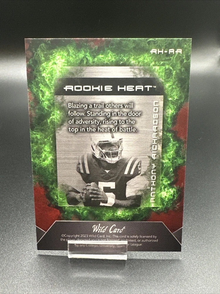 This 2023 Wild Card Matte Anthony Richardson Rookie Heat Purple /15 Colts RC is a must-have for any football enthusiast. With its stunning design and limited edition, this sports trading card is a valuable addition to any collection. The card features the talented Indianapolis Colts player and National Football League (NFL) prospect, Anthony Richardson, who is sure to make waves in the industry. The card is manufactured by Wild Card and belongs to the 2023 Wild Card set, which is highly sought after by collectors. Its features include a rookie designation, which adds to its appeal, and a heat purple color scheme, which makes it stand out. This trading card is perfect for fans of the sport and those looking to invest in valuable pieces. Please see pictures for conditions of the card you will be actually receiving. Message with any questions. Free Shipping. Thank you.