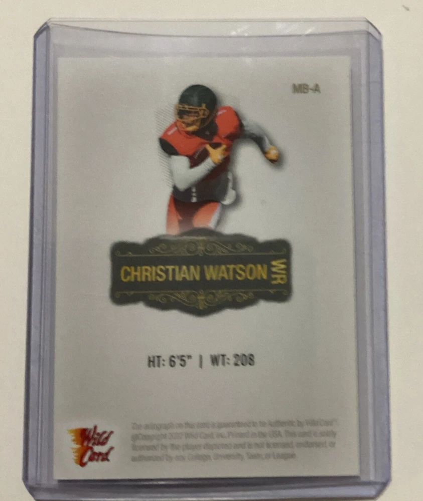The Wild Card Matte Christian Watson Auto #2/25 Red Foil Premium Autograph trading card features a serial number and is in near mint or better condition. Manufactured by Wild Card, this sports trading card showcases Christian Watson, a football player likely associated with the Green Bay Packers. With only 25 cards produced, this red foil premium autograph card is a highly collectible item for fans of sports trading cards, especially those interested in football memorabilia.