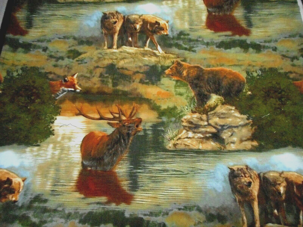 This is a very nice fabric that is 100% cotton. This is a premium quilting cotton by Robert Kaufman called Nature Studies. It has wild elk, bears, wolves & fox in their natural surroundings with water, rocks & trees. The main colors are brown, green & blue. READ: Because computer monitors show colors and shades differently, the fabric color can vary from the photos. If you have any questions regarding this, please contact me before purchasing it. I have been a quilter for 30 years and am an accomplished seamstress & would be happy to answer any questions you might have. This is for 1 Yard of fabric. If you purchase more than 1 Yard, I will give you one continuous cut. If you have a problem with anything you purchase from me, please contact me before leaving neutral or negative feedback and I will work it out with you. Payment is due within 48 hours. If payment isn't received within 5 days, it will automatically go to Ebay's resolution center for non-payment. INSTRUCTIONS FOR COMBINED SHIPPING: I Do combine shipping. You must put your items into your shopping cart and request an invoice from me using the request total button before completing the payment process. IF YOU'RE UNABLE TO COMBINE YOUR SHIPPING, PLEASE CONTACT ME. Payment is due upon receipt of your Thank you for looking and God bless you and your family. IF THERE IS A PROBLEM WITH ANY PURCHASE, PLEASE CONTACT ME, THE SELLER, VIA EBAY'S MESSAGING SYSTEM PRIOR TO OPENING A CASE--OPENING A CASE, EVEN IF RESOLVED SMOOTHLY, CAN HURT THE SELLER'S RATINGS. THANK YOU