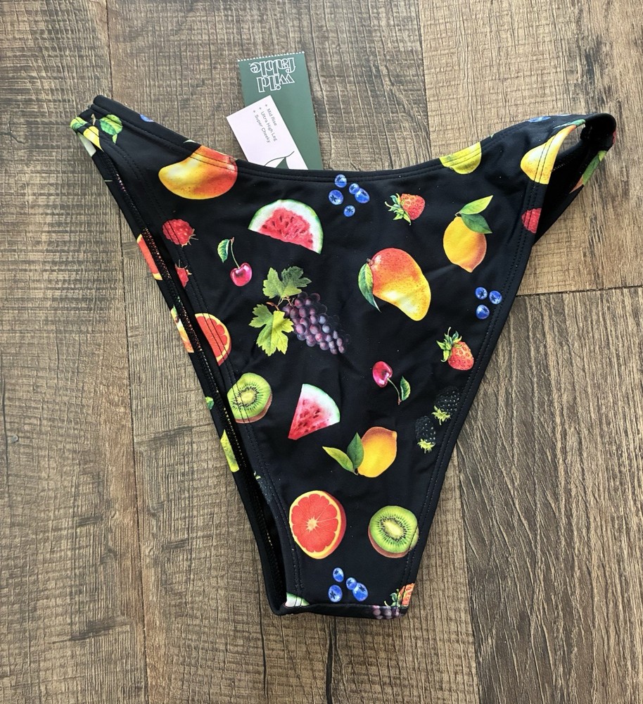 Wild Fable Women's Fruit Print Nylon Lined Mid Rise Bikini Swim Bottom Black S 4-6. Condition is new with tags. Smoke free, pet free home. Shipped via USPS Ground Advantage.