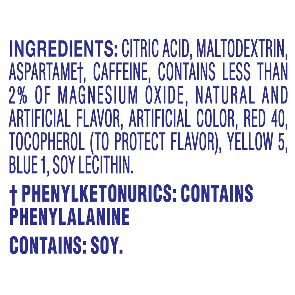 Store New Arrivals Add to Favorite View Feedback Wild Strawberry Artificially Flavored Powdered Drink Mix with Caffeine, 120 Ct Pack, 12 Boxes of 10 On-The-Go-Packets Description Item model number 00043000053850 Is Discontinued By Manufacturer No Product Dimensions 9.62 x 5.06 x 5.25 inches; 0.2 ounces Caffeine Content 60 milligrams Item Weight 0.01 Pounds Flavor Name Sugar-Free Wild Strawberry Units 13.2 Ounce Protein 0 Grams Item Form Powder Size 1.1 Ounce (Pack of 12) One hundred and twenty 0.11 oz packets of Crystal Light Artificially Flavored Wild Strawberry On-the-Go Powdered Drink Mix with Caffeine 60 mg of caffeine per packet for a boost of energy Powdered strawberry fruit drink mix packets are small and easy to pour for on-the-go convenience Individual packets are ideal for adding strawberry flavor to a standard 16.9 fl oz water bottle Strawberry flavor for a sweet, fruity taste Made with zero sugar and 10 calories per packet for a guilt-free refreshment 90 percent fewer calories than leading beverages; this product is 10 calories, leading beverages are 130 calories SNAP & EBT eligible food item Crystal Light Artificially Flavored Wild Strawberry On-the-Go Powdered Drink Mix with Caffeine is a deliciously fruity drink you can enjoy anywhere. With zero grams of sugar and 10 calories per packet, Crystal Light fruit drink powder is a sweet alternative to juice and soda and has 90 percent fewer calories than leading beverages (this product is 10 calories, leading beverages are 130 calories), so you don't have to choose between taste and calories. Each sugar-free drink mix packet has 60 milligrams of caffeine so you can be at your best all day long. Each 0.11 ounce individual packet in our 12 pack of 10 count boxes (120 packets total) of powdered fruit drink mix fit easily in your bag, desk, or car, so you can enjoy a refreshing glass of Crystal Light anywhere. Simply empty one packet from the box into a bottle of water or a glass with 2 cups of water, shake or stir, and enjoy! All the flavor and only 10 calories per packet, just the way you like it. ABOUT US We offer the best prices around on high quality products. Our E-store includes media such as books, movies, music and games while offering electronics, toys, sporting apparel, clothing, tools, general home, garden items and more. SHIPPING We are always working hard to ensure your package arrives as soon as possible. Please understand that some factors like weather, high postal traffic, and the performance of shipping companies are outside of our control. We offer free shipping to the lower 48 states and ship within 2 business days of payment, usually sooner. We do not accept P.O. Boxes. Please provide a physical address. RETURNS We offer a 30-Day Return Policy on items which you are not completely satisfied with. You have the option for a full-refund or an exchange of the item. No returns are available on items shipped outside of the USA. PAYMENT We accept PayPal. CONTACT US This page content is yet to come Please ad us to your favorite seller and visit again later Thank You