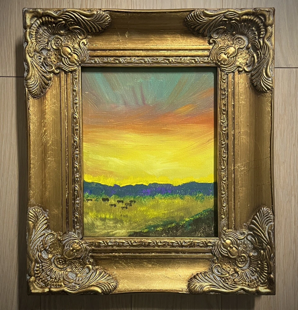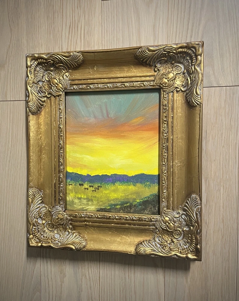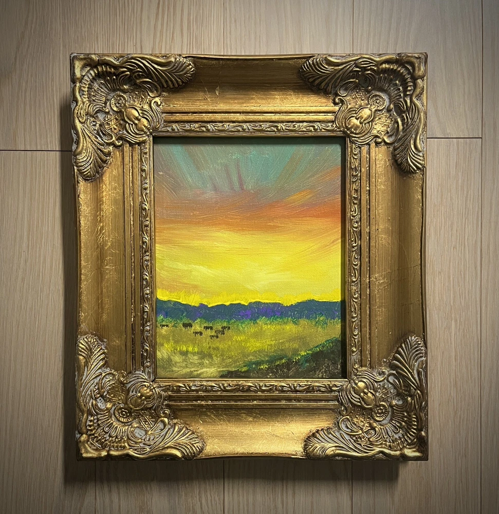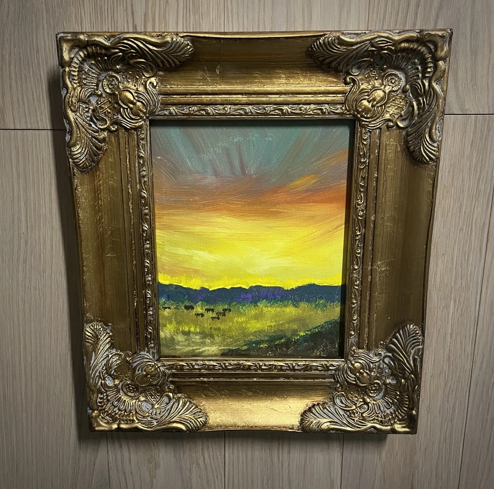 “Twilight on the Frontier” As the golden sun dips toward the horizon, the vast plains of the Wild West glow with hues of amber and violet. Distant mountains, their silhouettes softened by the evening haze, stand as silent sentinels watching over the land. Below, a herd of bison grazes undisturbed, their dark forms blending into the lush, rolling grasses that ripple with the fading light. This is a moment of peace—a brief pause in the rugged world of cowboys, pioneers, and uncharted wilderness—where nature reigns supreme, untouched and eternal. FRAME: framed MEDIUM: Acrylic paint premium artist quality Art work is signed by Impressionist from US MD Artist painter Max Kravt. MFA and Cumberland art member. Shipping via USPS tracked and insured. Shipping free for buyers in the US. Please check my other artworks and paintings in the seller account -> other items for sale. This listing is for original artwork landscape oil painting, not a print or copy of any kind. Max