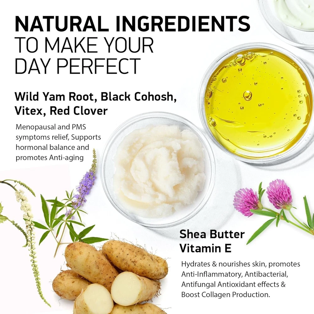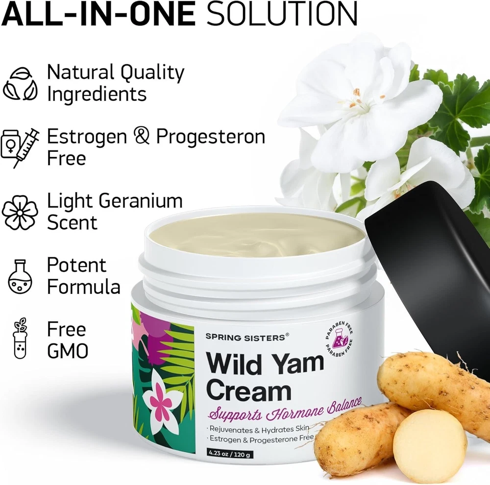Wild Yam Cream for Hormone Balance Experience natural relief and support for menopause and PMS symptoms with our premium Wild Yam Cream. Formulated with a powerful blend of traditional herbal ingredients like Wild Yam Root , Black Cohosh , Vitex , and Red Clover , this cream is designed to promote hormonal harmony and comfort during life's transitions. Key Benefits: 🌿 Menopause & PMS Support : Helps relieve symptoms such as hot flashes , mood swings , and night sweats . 🌱 Natural Ingredients : Contains pure Wild Yam Root, Shea Butter, and Vitamin E for a safe, paraben-free formula. 💧 Moisturizing & Revitalizing : Infused with Shea Butter and Vitamin E to nourish, moisturize, and rejuvenate the skin, leaving it soft and supple. ⚖️ Hormonal Balance : A synergistic blend of Wild Yam Root, Black Cohosh, Vitex, and Red Clover traditionally known for supporting hormonal balance. 👩🦰 For Women & Men : While specially formulated for women's hormonal wellness, men may also benefit from its natural support properties. Why Choose Our Wild Yam Cream? Natural Wellness : Made with high-quality, natural, and organic ingredients. Gentle & Absorbs Quickly : A non-greasy formula that absorbs easily for daily use. Versatile Solution : Perfect for menopausal support, PMS relief, and skin nourishment. Ingredients : Wild Yam Root Black Cohosh Vitex (Chaste Tree Berry) Red Clover Shea Butter Vitamin E How to Use: Apply a small amount to clean, dry skin 1-2 times daily. Gently massage until absorbed. Ideal for use on wrists, neck, or abdomen. Legal Disclaimer : Statements regarding dietary supplements have not been evaluated by the FDA and are not intended to diagnose, treat, cure, or prevent any disease or health condition. Experience Natural Hormonal Balance Today! Rejuvenate your skin and embrace comfort and well-being with our Wild Yam Cream – the natural solution for hormonal balance and menopausal relief.