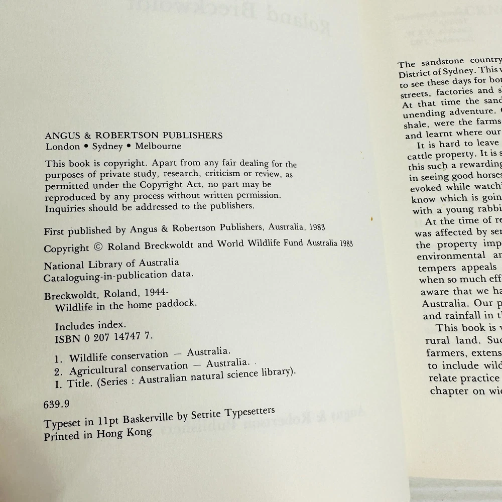 Wildlife in the Home Paddock Conservation for Australian Farmers Breckwoldt Item posted within two business days of payment clearing via Australia Post. Australian seller - smoke free - pet free - working mum Adding new book listings daily to my store. My books are sent in strong Australia Post, Australian made, water resistant padded mailers that are recyclable through the REDcycle program and can be recycled at any major shopping centre. Pre-owned, see photos for condition and read the description.