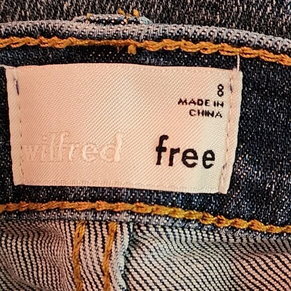 Wilfred Free Medium Wash Stretch Denim Raw Hem Tanit Skirt style tags: grunge, festival, distressed, Y2K Women's 8 Waist: 14.5" Length: 15.5" (front); 17" (back) Good used condition: no rips, marks or stains