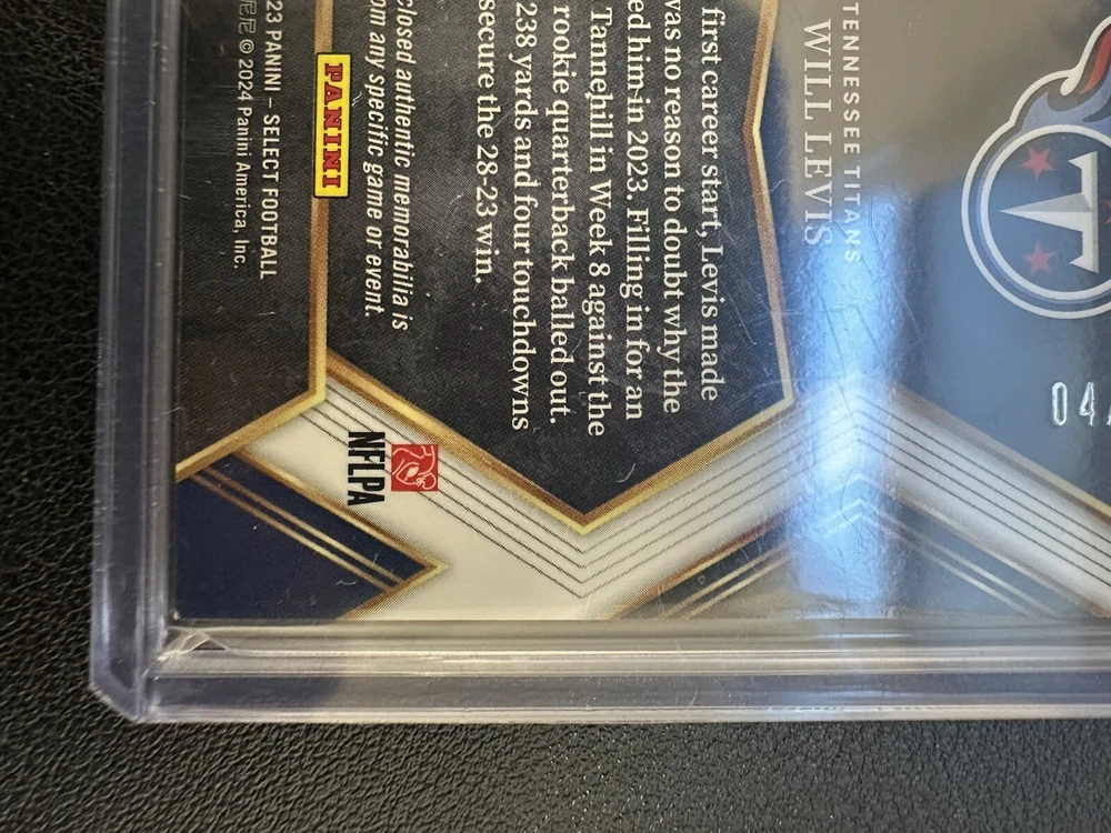 This is a rare and highly sought-after Will Levis Rookie 2023 Select Draft Selection Patch Tye Dye Titans trading card. With a print run of only 25, this card is a must-have for any serious collector. The card features a stunning Tie-Dye Prizm parallel/variety and is made from high-quality 130 Pt. card stock. The card is an original and comes from the National Football League (NFL) manufacturer Select. It is ungraded and has not been autographed. The card is in English and was manufactured in the United States in 2023. The card features Will Levis, a player for the Tennessee Titans, and is a great addition to any football fan's collection.