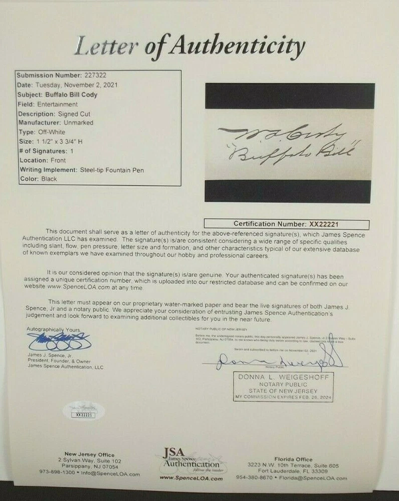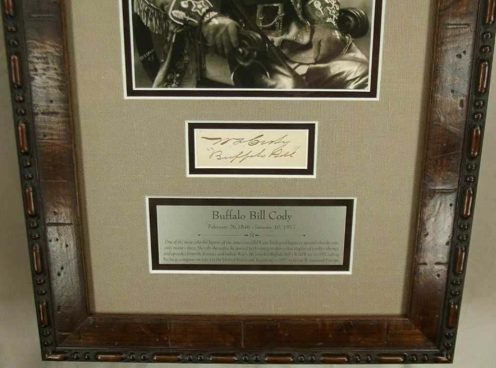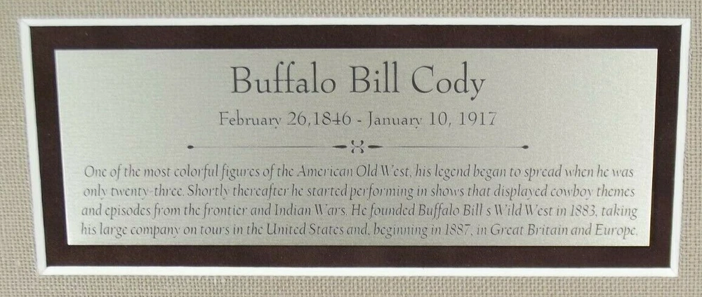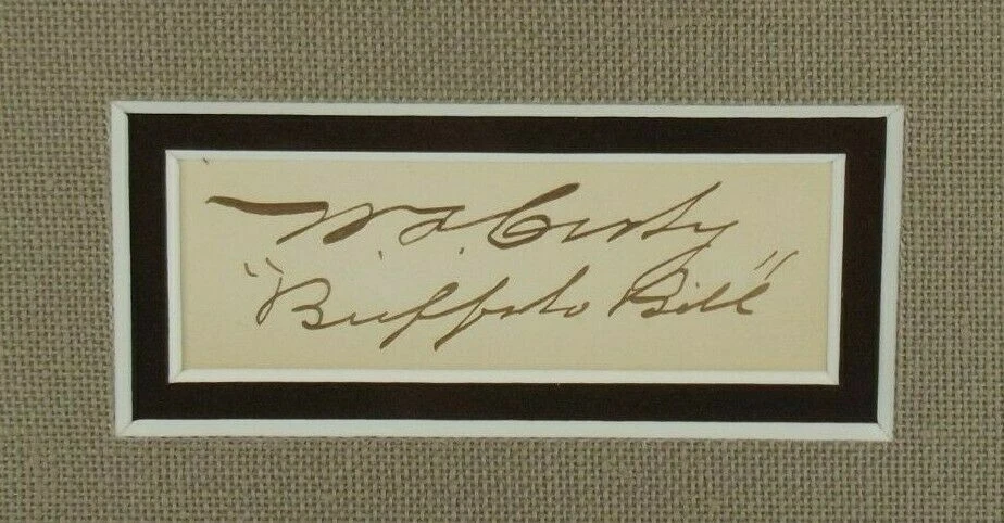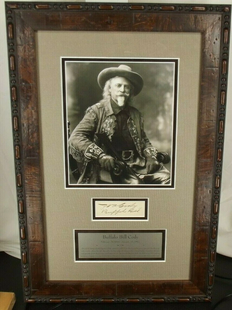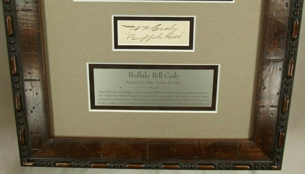 William Frederick ''Buffalo Bill' Cody [1846 1917] was a American scout, bison hunter and showman who was born in the Le Claire Iowa Territory later known as the U.S state of Iowa. Cody began working at the age of 14 as a rider for the Pony Express and served with the Union Army during the American Civil War. Cody received the nickname ''Buffalo Bill'' after the American Civil War when he had a contract to supply Kansas Pacific Railroad workers with buffalo meat and it is purported he killed over 4,000 buffalo between 1867 and 1868. After the war he served as a civilian scout for the U.S Army during the Indian Wars and was awarded the Medal of Honor in 1872. Cody is considered one of the most colorful figures of the American Old West and Bill's legend began to spread when he was only twenty-three when he began performing in shows that displayed cowboy themes and episodes from the frontier and Indian Wars. In 1883 he founded the Buffalo Bill's Wild West Show and began touring the United States and in 1887 he toured in Great Britain and Europe. Listed for auction is a stunning display which contains the authenticated autograph of William Frederick ''Buffalo Bill'' Cody. The autograph is signed on a card, ''W.F. Cody'' and he added ''Buffalo Bill'' in black fountain pen. The card measures 3.50 x 2.50 inches, with 3.50 x 1.50 inches displayed, other then trivial even toning the autograph is in fine condition and is bold and displays wonderfully. The autograph has been authenticated by JSA, James Spence Authentication and will be accompanied with the above Letter of Authenticity. The display has been assembled around a wonderful formal b/w portrait 7.00 x 9.00 of Buffalo Bill. Mounted below is a professionally engraved plaque which reads as follows, ''William Frederick ''Buffalo Bill'' Cody. February 26, 1846 - January 10, 1917. One of the most colorful figures of the American Old West, his legend began to spread when he was only twenty-three. Shortly thereafter he started performing in shows that displayed cowboy themes and episodes from the frontier and Indian Wars. He founded Buffalo Bill's Wild West in 1883, taking his large company on tours in the United States and beginning in 1887, in Great Britain and Europe. The display itself is stunning and has been professionally assembled in acid free materials as follows, each item has been matted in a beige linen outer matte and accented with a brown inner matte. The display has been completed in a western themed quality ornate distressed brown wood frame to the dimensions of 21.00 x 14.00 inches. The autograph is a wonderful example, authenticated, bold, beautifully framed and ready to be displayed in your collection. Absolutely no disappointments . We have listed a nice collection of aviation, military and astronaut autographs. Dear Collector, we are regularly adding autographed framed displays to our eBay Store. The following is a sample of our inventory, Harry Houdini, Marilyn Monroe, George Custer, Elvis Presley, U.S. Presidents John F. Kennedy, Harry S. Truman, Franklin D. Roosevelt, Theodore Roosevelt, James Garfield, James Monroe, Erwin Rommel, Robert Oppenheimer, Bela Lugosi, Boris Karloff, Ernest Hemingway, Abner Doubleday, Auguste Bartholdi, Buffalo Bill Cody, Walt Whitman, Charles Dickens, Margaret Mitchell, Thomas Edison, Charles Lindbergh, Amelia Earhart, Alexander Graham Bell, Laurel & Hardy, Charlie Chaplin, George Patton, Gutzon Borglum, Samuel F. B. Morse, Brigham Young, Wernher von Braun, Lon Chaney Jr, P.T. Barnum, Apollo Astronaut crews, and many more. Please have a look and feel free to contact us with any questions. Happy collecting from collectors.view Autographs. Authenticity/Return Policy/About Us. Dear collector, we are lifetime autograph collectors and an autograph dealer with over 20 years of autograph sales on eBay. We believe the purchase of an autograph is a monetary investment. Our policy is simple, all our autographs are researched and guaranteed authentic with ''No'' time limits. All sales will be accompanied with our Certificate of Authenticity, and we also offer a 30-day unconditional return policy, If the autograph or display you purchased is not as stated or is not to your expectation simply return and we will refund your full purchase price along with your return shipping costs. We are also a Top-Rated eBay seller with thousands of satisfied customers. We feel you should be comfortable with your purchase and our policy reflects this. United States and Overseas Shipping/Handling. Please Read.... Dear collector, shipping in the U.S is free unless otherwise noted in the auction description. Your auction will be well packed and shipped United States Postal Service 1st class with delivery tracking with the exception of larger framed items which will be shipped United States Priority Mail with signature confirmation. To our overseas customers shipping is as follows, your auction will be shipped through eBay's Global Shipping Program. Note, the limit for shipping an auction overseas is 2500.00 dollars, any auction above this price cannot be shipped. We do combine shipping on paper items [letters, photographs, album pages, etc.] purchased together. Also please note we do not have control over a package once it has shipped and import duties, taxes and custom charges are determined by the Global Shipping Program. Thank you for your purchase, your auctions will be well packed and shipped upon payment. Sign up for my email newsletters by adding my eBay Store to your Favorites
