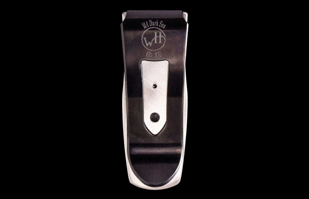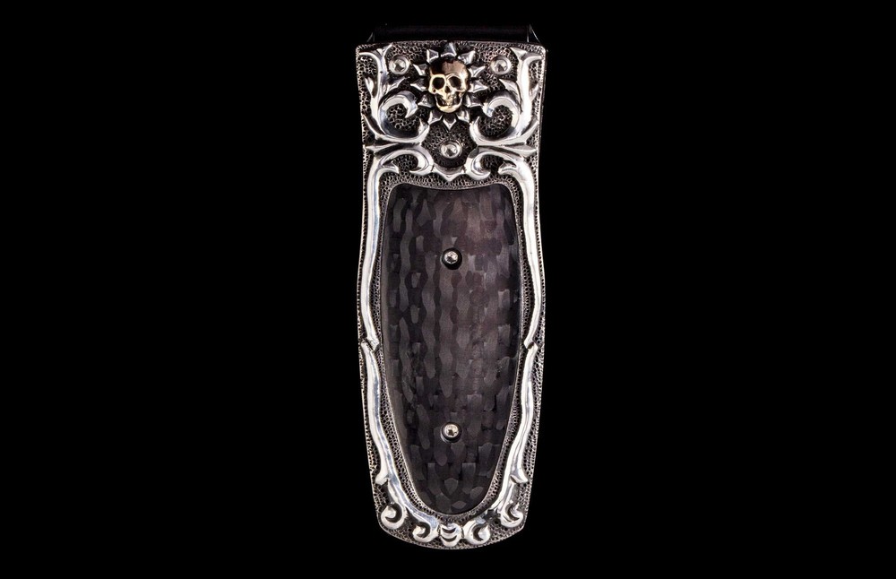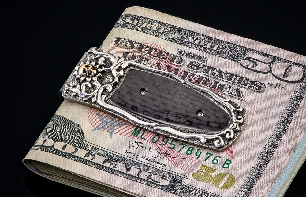 The Pharaoh ‘Dark Sea’ features a frame in hand-carved sterling silver with gold skull by Lee Downey, inlaid with carbon fiber. The clip is machined and blast-polished from tempered stainless steel, with a beautiful engraving bright cut against the matte-finished background. Pharaoh money clip - inspired by the designs of ancient Egypt - draws on the elegant vessel forms of antiquity to create a simple yet striking range of possibilities, rendered in a variety of our hallmark materials and techniques. An elegant form with an enduring legacy.