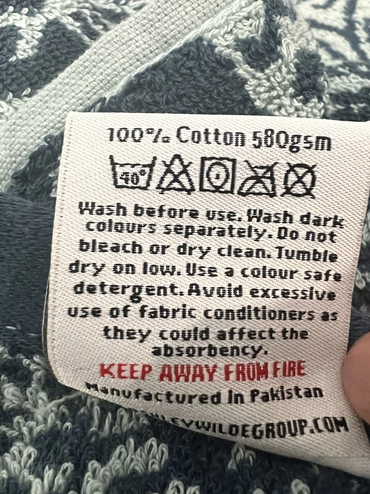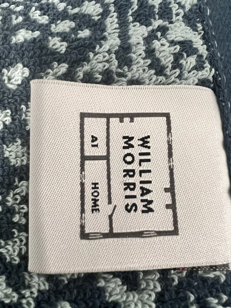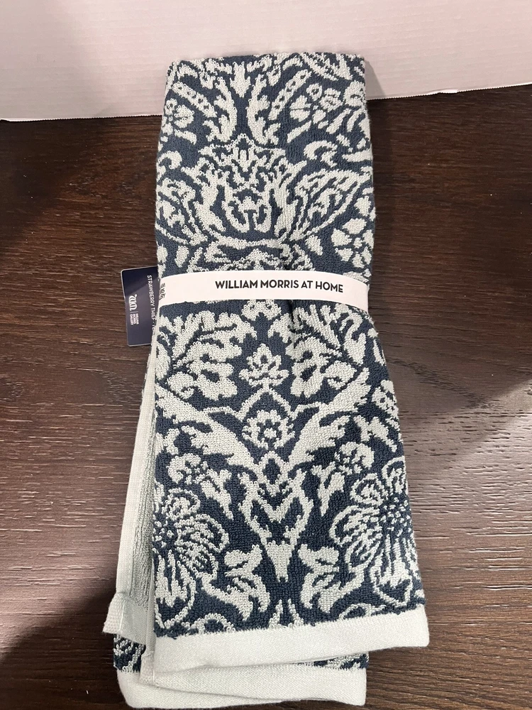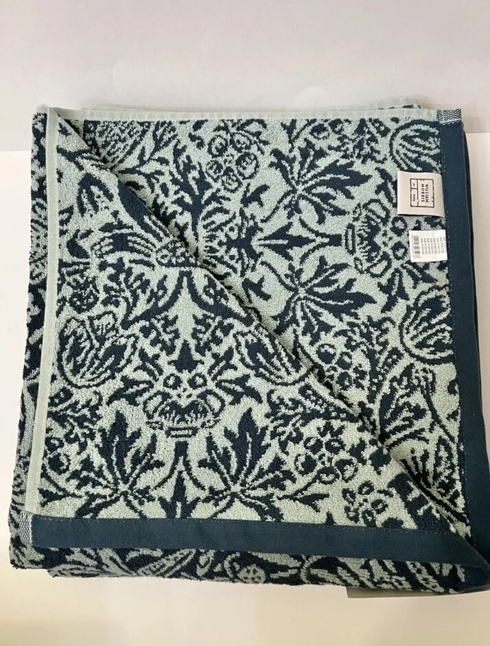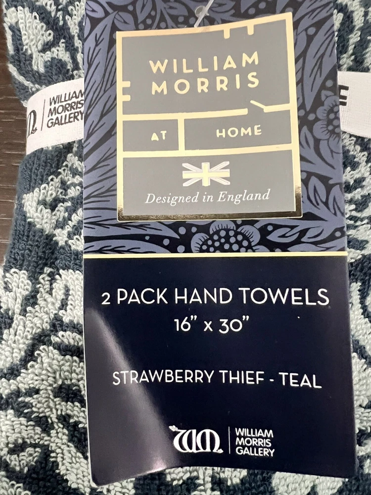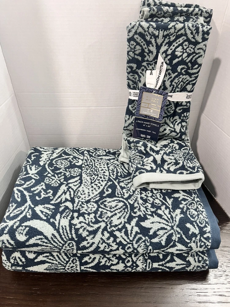 The William Morris Strawberry Thief Teal towel set includes two bath towels and two hand towels in a four-piece set. The towels are made of 100% cotton and are OEKO-TEXT and Standard 100 certified. The set features a rectangular shape and bath towels measures 40 inches by 59 inches. The towels are designed with a Strawberry Thief Teal pattern and are suitable for use in the bathroom, guestroom, or utility/laundry room. Care instructions include tumble drying, machine washing with like colors, and avoiding bleach. The set is part of the Original Morris & Co product line and is manufactured in Pakistan. Bath towels are larger than average size. Beautiful and unique designs. Smoke free home
