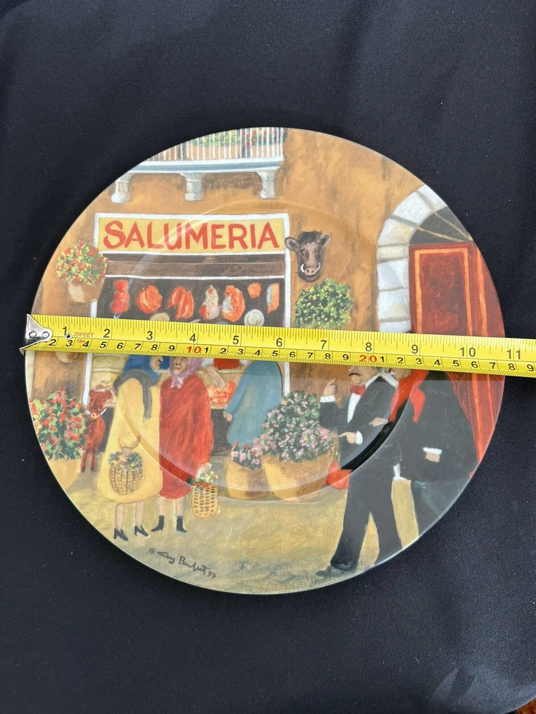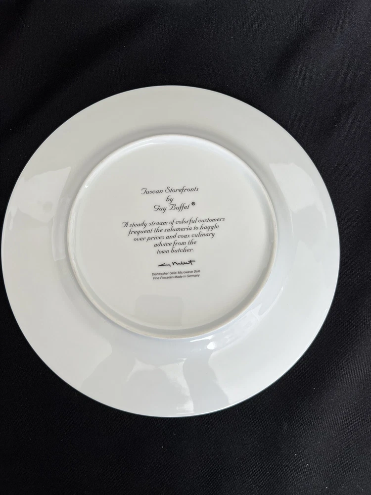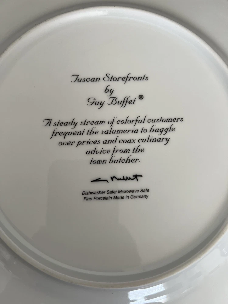 Set Includes:Dinner PlatePlate Diameter:10.875 inchBackstamp:PrintedBrand:Guy BuffetMicrowave Safe:YesEra:Late 20th Century (1970-1999)Year Manufactured:1997Antique:NoCountry/Region of Manufacture:GermanyPlate Name:La CaciotecaFinish:GlossyShape:RoundPattern:TUSCAN STOREFRONTSHandmade:NoProduct Line:TUSCAN STOREFRONTSItem Height:.75 inchMaterial:PorcelainColor:Multi-ColorCare Instructions:Machine Washable up to 140°FOriginal/Licensed Reproduction:OriginalTheme:Market Place, PeopleOrigin:AmericaNumber of Items in Set:One-pieceFeatures:DecorativeItem Weight:25 ouncesProduction Technique:PotteryItem Width:10.875 InchesTime Period Manufactured:1990-1999Type:PlateStyle:ContemporaryVintage:YesOccasion:All Occasionsgtin13:Does not applyUPC:Does not applyDepartment:Adults