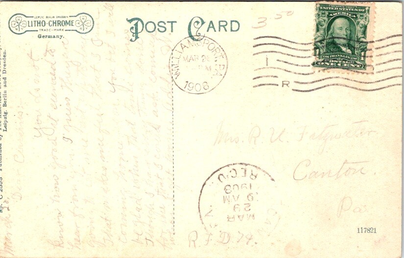 Country of Origin:United StatesRegion:PennsylvaniaMaterial:PaperType:Printed (Lithograph)Original/Licensed Reprint:OriginalUnit of Sale:Single UnitTheme:Architecture, Cities & Towns, Community Life, Domestic & Family Life, Occupational, Patriotic, FlagNumber of Items in Set:1Era:Divided Back (1907-1915)Country:United StatesContinent:North AmericaSubject:Post OfficeCity:WilliamsportPostage Condition:Posted