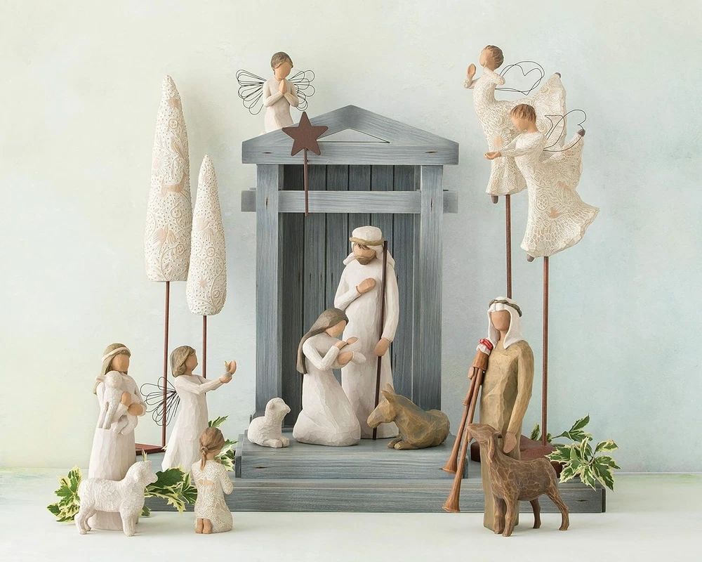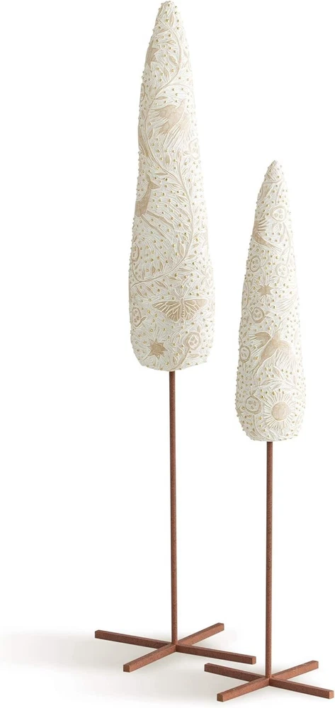 Sentiment: ”Rooted in the earth, reaching toward the sky” written on Enclosure Card Two hand-painted resin trees, tallest is 16.5”h. Cream-colored, slender, vertical sculptures; one taller, one shorter. Surfaces extensively carved with symbols of nature and dotted with gold leaf. Trees elevated on metal rods with stable base, sized to complement the Willow Tree Nativity collection. The two-piece set of Cypress Trees is designed to enhance the Willow Tree Nativity. The elegant architecture of these majestic yet simple trees creates a visually uplifting form in the nativity collection. Each tree is uniquely carved with symbols of nature. Pinpoints of gold leaf reflect light and create interest. Packaged in fitted box ready for gift-giving. Artist Susan Lordi hand carves the original of each Willow Tree piece from her studio in Kansas City, MO. These pieces are cast from Susan's original carvings and painted by hand. Ready to display on a shelf, table or mantel. To clean, dust with soft brush or cloth.