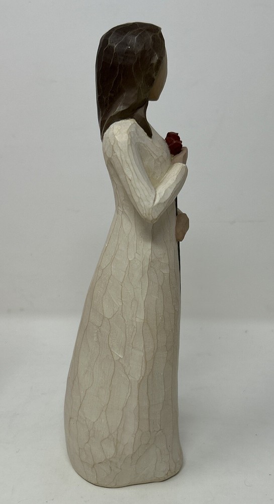 This beautiful Willow Tree figurine by Susan Lordi is a must-have for any collector. Titled "Love," it features a stunning abstract design with a single rose and a tan color finish. Measuring 9 inches in both height and length, it is the perfect size for display on any shelf or table. This figurine was manufactured in 2003 by DEMDACO and is part of the Willow Tree collection. It is an original piece and not a reproduction. The figurine is made of clay and has a matte finish. It is not handmade and was produced using job production techniques. This piece is perfect for all occasions and is a great addition to any decorative collection. Check pictures for condition and measurements for size.