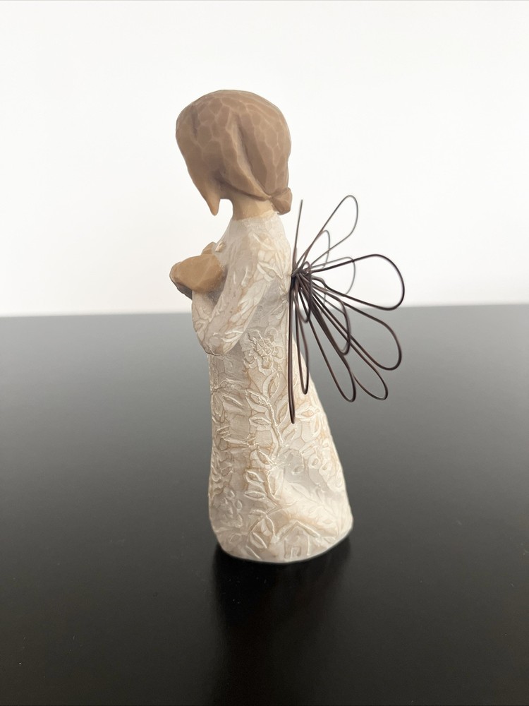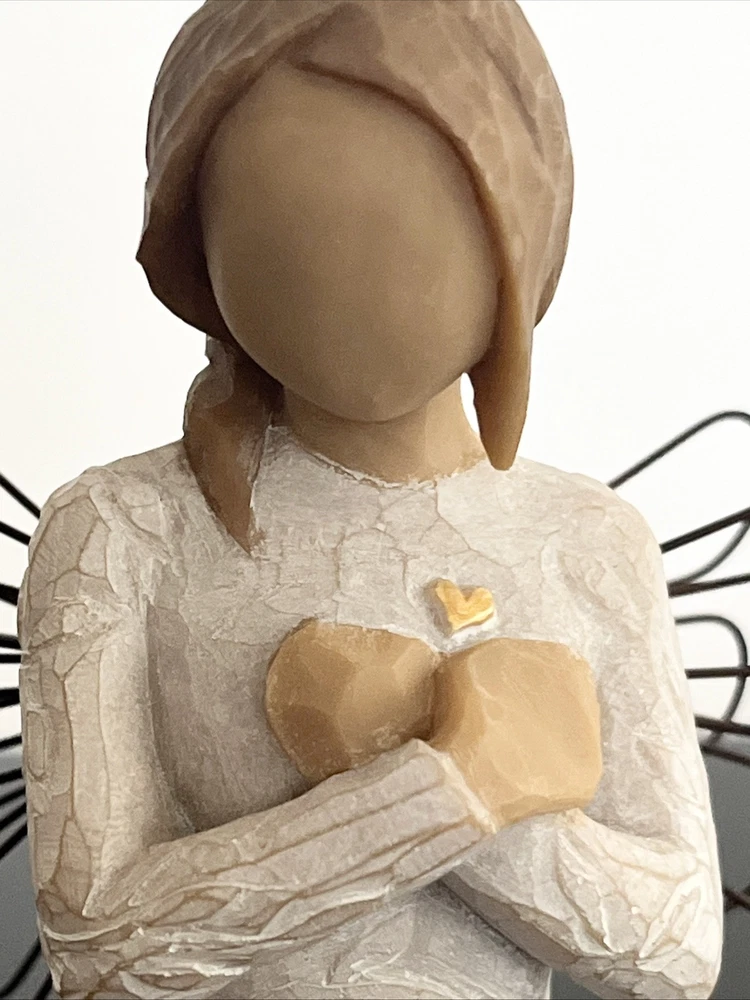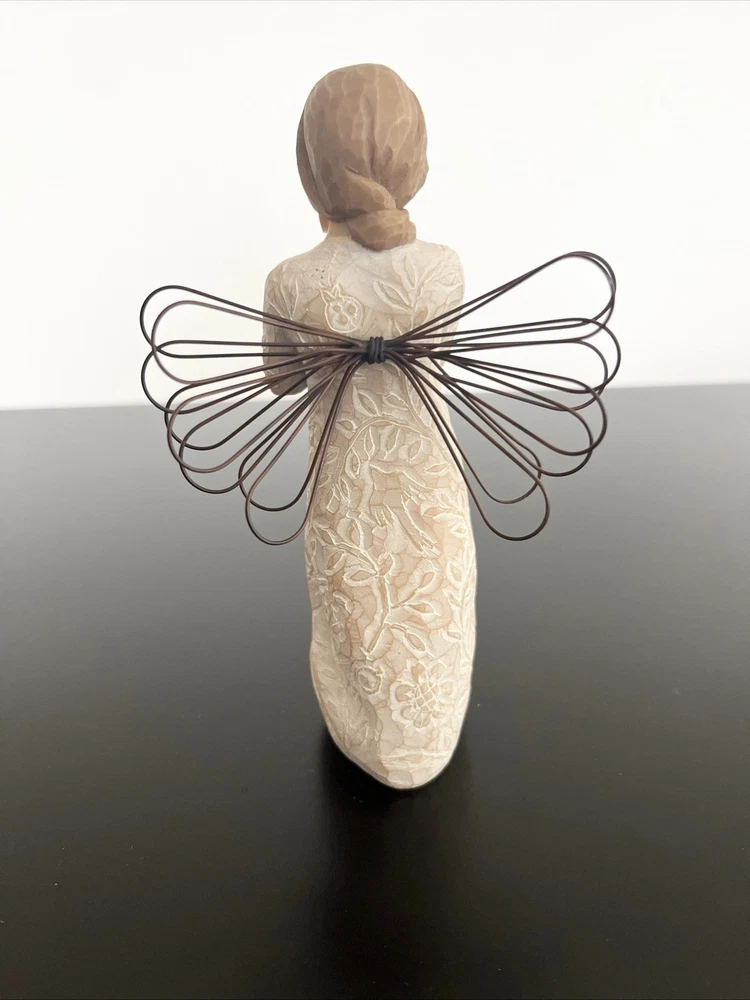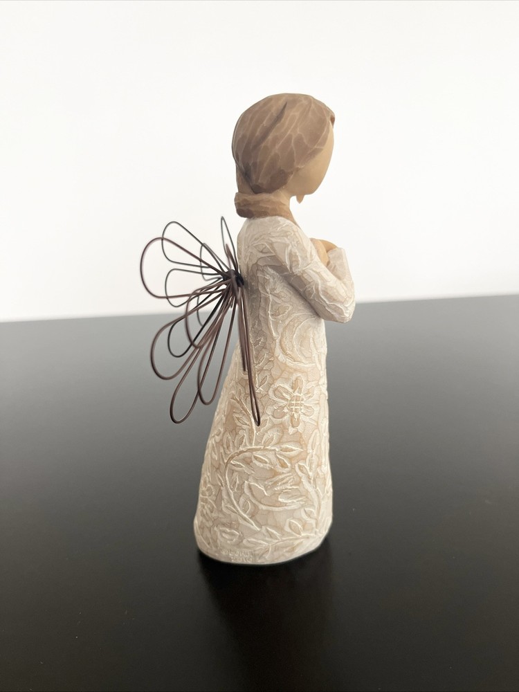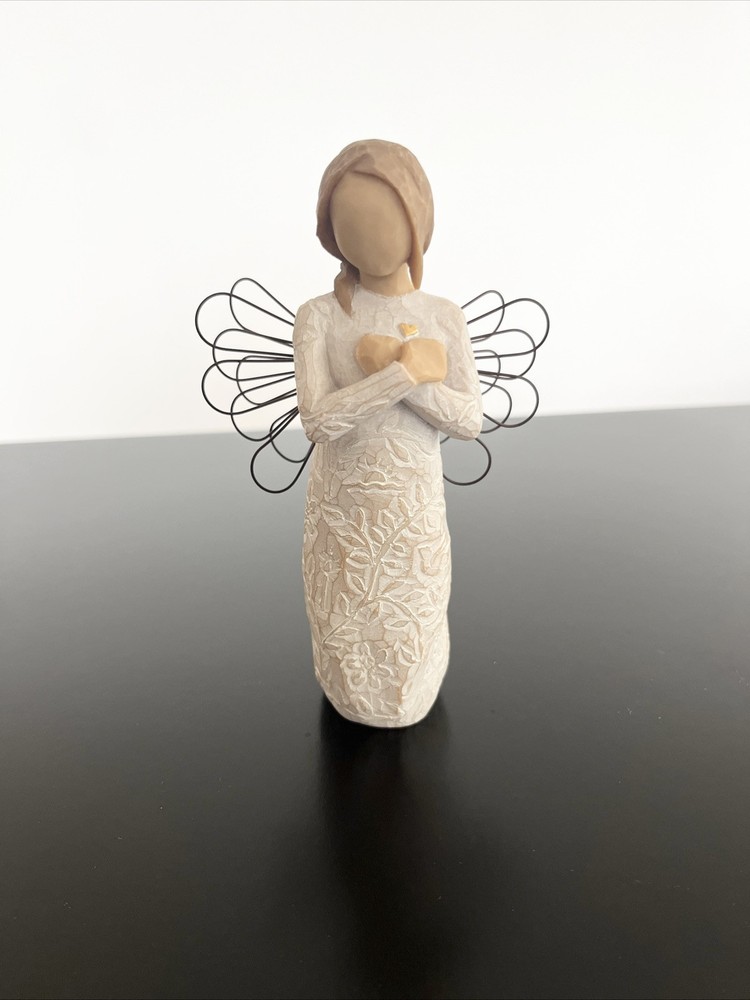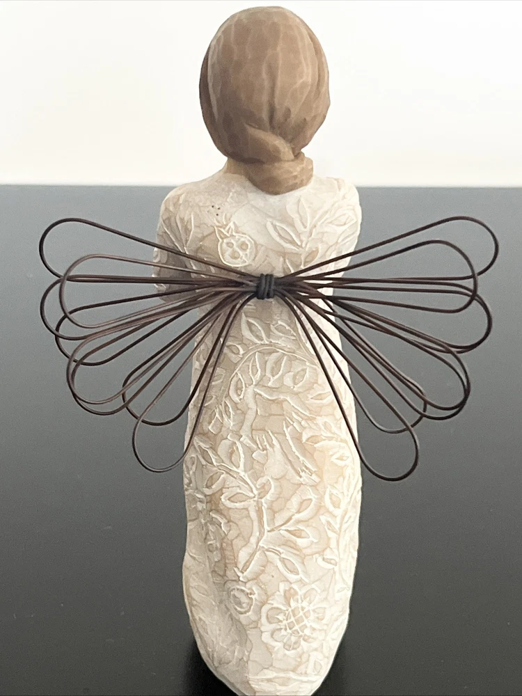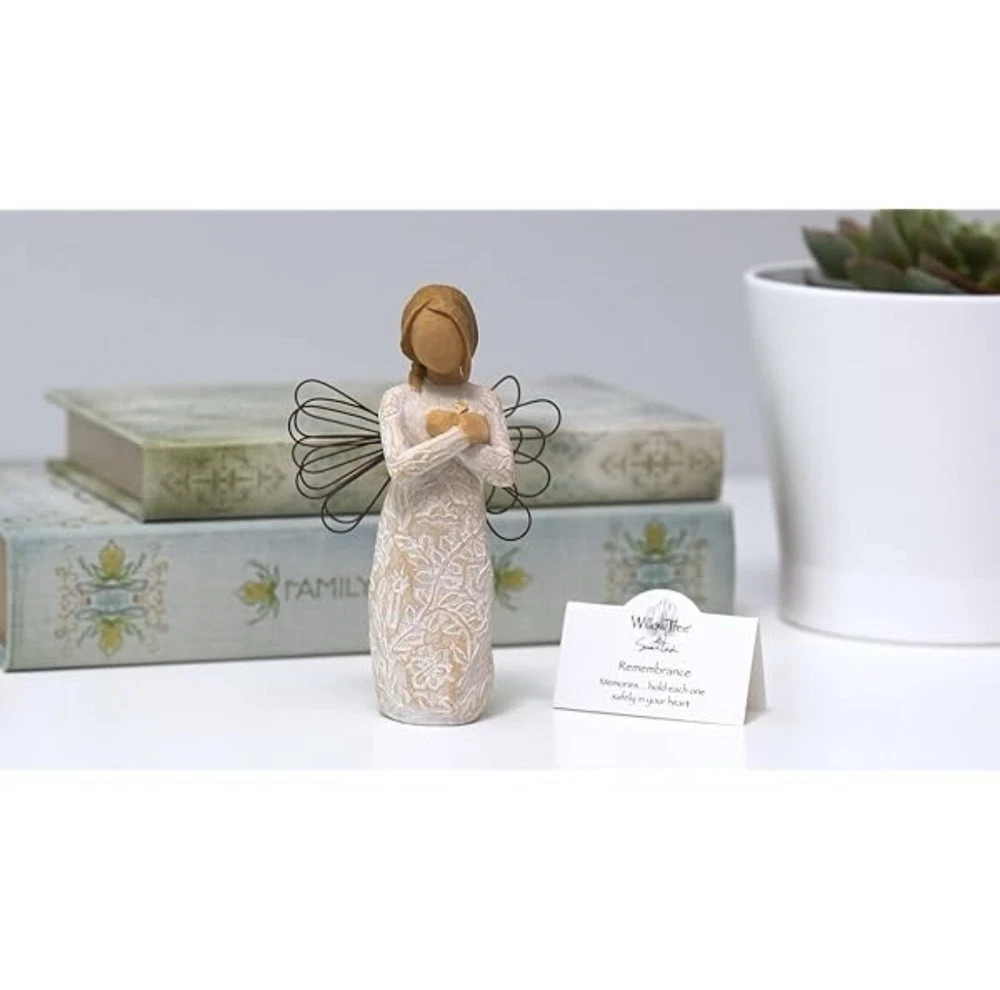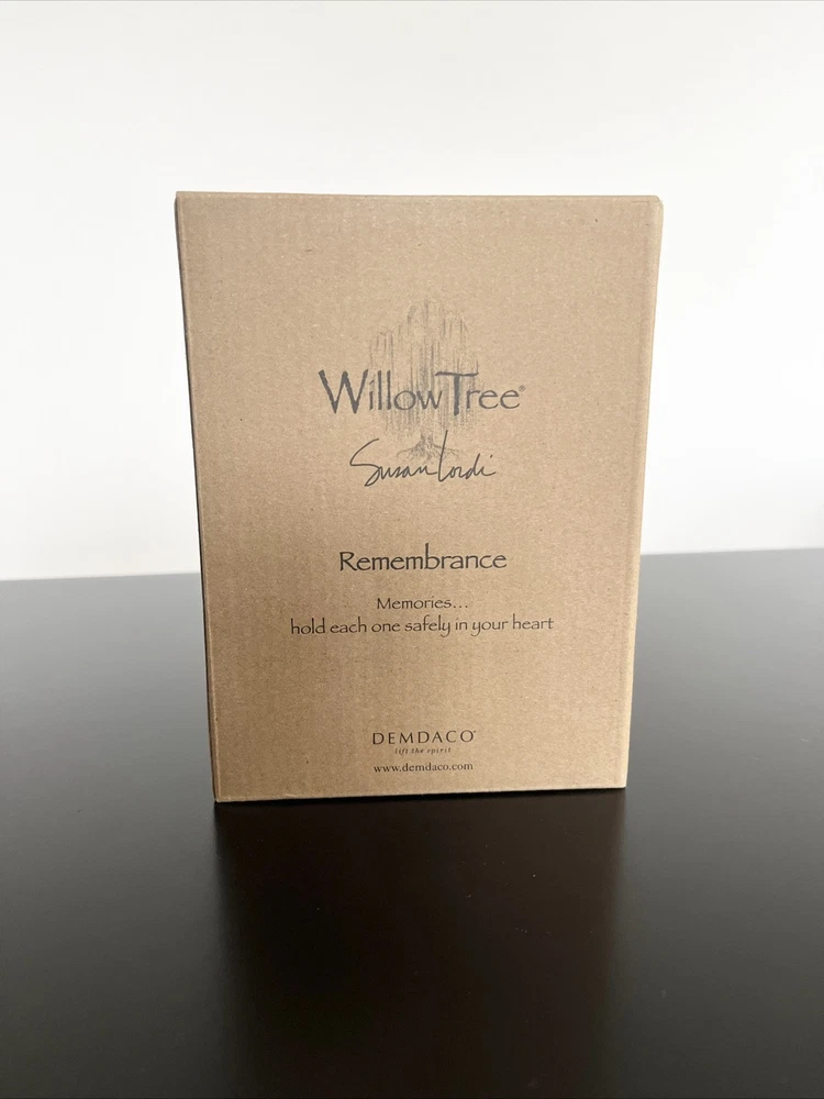 Willow Tree Remembrance Angel – Hand-Painted Sculpted Figurine – Brand New in Box Capture the essence of remembrance and love with the Willow Tree Remembrance Angel , a beautifully hand-painted figurine designed by artist Susan Lordi . This elegant piece features a standing angel with wire wings, gently cradling her hands over her heart in a gesture of love and memory. Product Details: Brand : Willow Tree Collection : Remembrance Artist : Susan Lordi Material : Hand-painted resin with wire wings Height : 5.5 inches Color : Light Skin Tone with a soft, neutral finish Packaging : Comes in the original box with an enclosure card featuring a meaningful sentiment Meaning & Symbolism: The Willow Tree Remembrance Angel is a heartfelt tribute to cherished memories and loved ones. Whether given as a sympathy gift, memorial keepsake, or a thoughtful gesture to someone going through a loss, this angel serves as a comforting reminder that memories live on in our hearts. The gentle, peaceful design makes it a perfect display piece for a home, office, or memorial space. Condition: Brand new, unopened, and in its original packaging. Perfect for gifting or collecting. Ideal For: ✔️ Sympathy & Memorial Gifts ✔️ Home or Office Décor ✔️ Collectors of Willow Tree Figurines ✔️ Thoughtful Gifts for Loved Ones This authentic Willow Tree figurine embodies simplicity, comfort, and warmth. A timeless piece that brings peace and meaning to those who receive it. If you have any questions, feel free to ask! Fast shipping and careful packaging guaranteed.