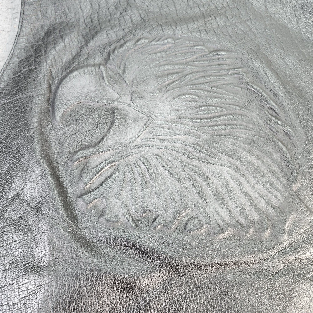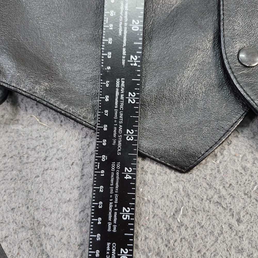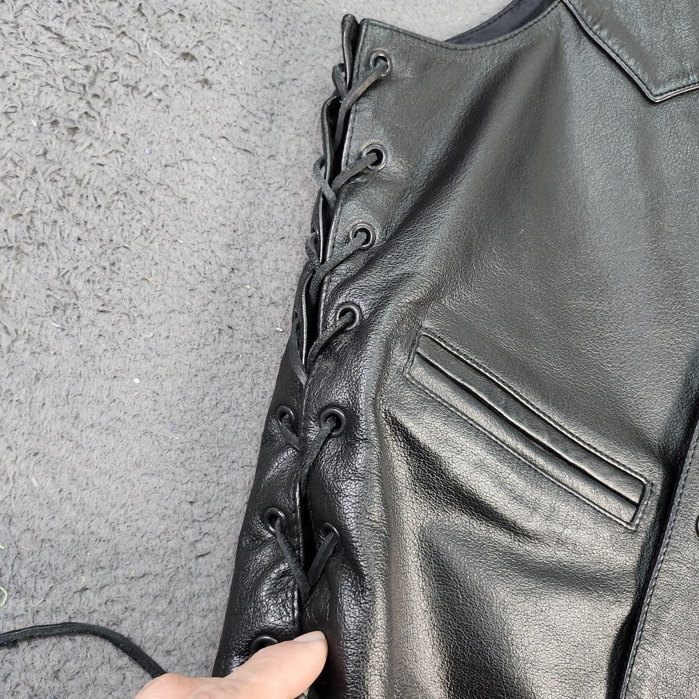Brand: Wilsons Leather (Open Road collection). Style: Mens biker motorcycle vest with snap front closure and collarless V-neck neckline. Color: Solid black leather exterior with black lining. Size: Mens Medium (tagged M on interior Open Road Wilsons label). Material: Genuine leather outer shell with smooth woven lining (exact fiber content not listed on visible tags). Country of origin: Made in Pakistan; care tag notes that leather garments must be cleaned by professionals specializing in leather care. Design details: Four-snap single-breasted front, angled western-style front yokes, two front welt pockets, and full interior lining for comfort. Side and back details: Adjustable lace-up sides with metal grommets for fit and layering over shirts or jackets, plus a large embossed eagle head graphic on the back panel for classic biker styling. Features and use: Collarless leather riding vest ideal for motorcycle wear, casual layering in fall and spring, and biker or motorcycle-themed outfits where a tough, classic leather look is desired.