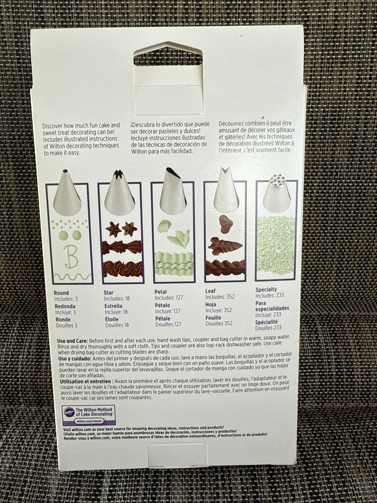 Wilton Cake Decorating Set - 25 Pieces Stock Number 2104-5839 Includes: 5 decorating tips (3, 18, 127, 352, 233) 18- 12 in disposable decorating bags 1 Twist Quick decorating coupler 1 bag cutter Illustrated decorating techniques