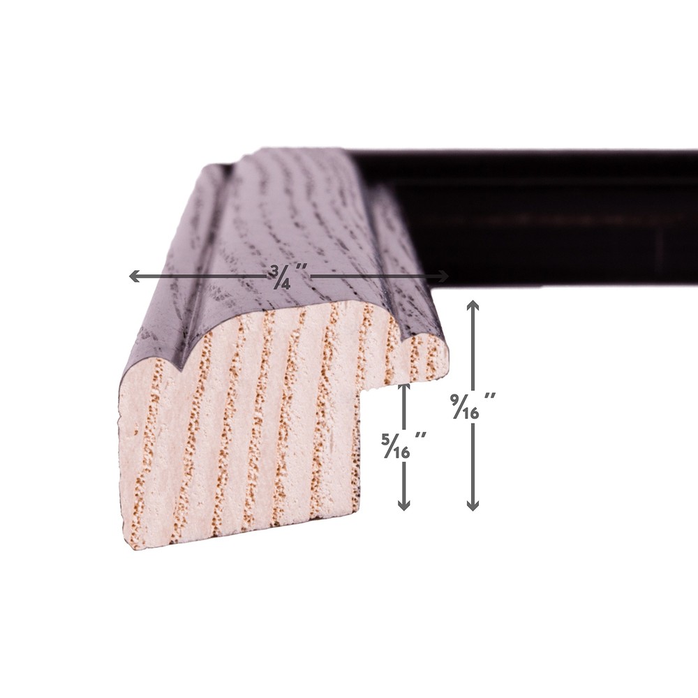 Traditional style; semi-gloss black stain finish; visible wood grain **COLOR AND GRAIN PATTERN MAY VARY SLIGHTLY WITH EACH FRAME** Frame includes: white matting, clear acrylic facing, rigid cardboard backing and wire hanging hardware kit (some assembly required) Matted frame is designed to display a 16 x 20 inch photo/print/poster (matting will overlap image by .25" on each side). Frame will display a 20 x 24 inch photo/print/poster without the matting (frame lip will overlap image by .25" on each side). Frame moulding is 0.75 inches wide; solid Ash wood construction Frame is designed for WALL HANGING only (hanging hardware allows for portrait or landscape orientation)
