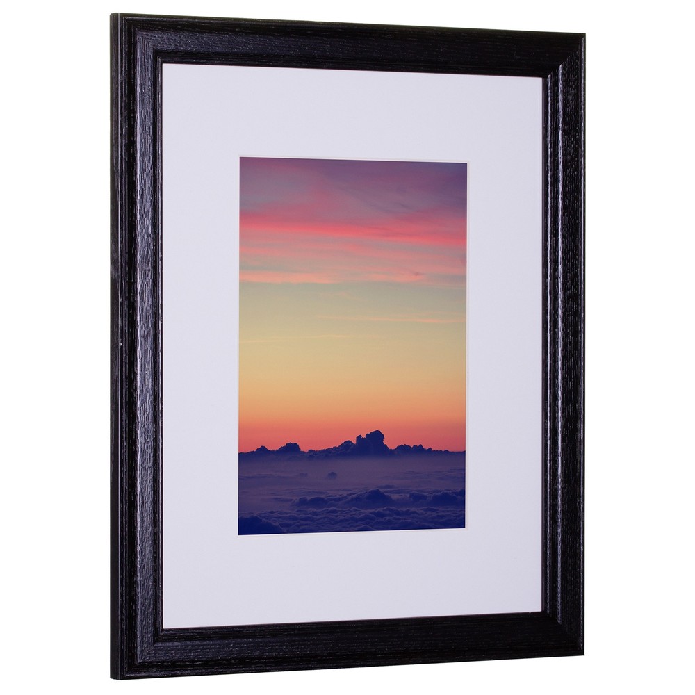 Traditional style; semi-gloss black stain finish; visible wood grain **COLOR AND GRAIN PATTERN MAY VARY SLIGHTLY WITH EACH FRAME** Frame includes: white matting, glass, rigid black backing and pre-attached stamped hanging hardware Matted frame is designed to display a 5 x 7 inch photo/print/poster (matting will overlap image by .25" on each side). Frame will display a 8 x 10 inch photo/print/poster without the matting (frame lip will overlap image by .25" on each side). Frame moulding is 0.75 inches wide; solid Ash wood construction Frame is designed for WALL HANGING only (hanging hardware allows for portrait or landscape orientation)