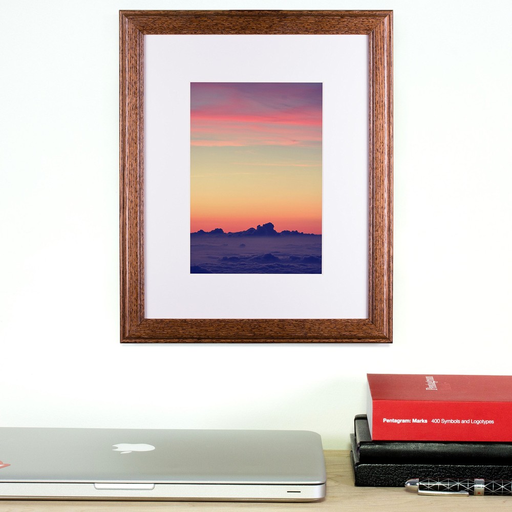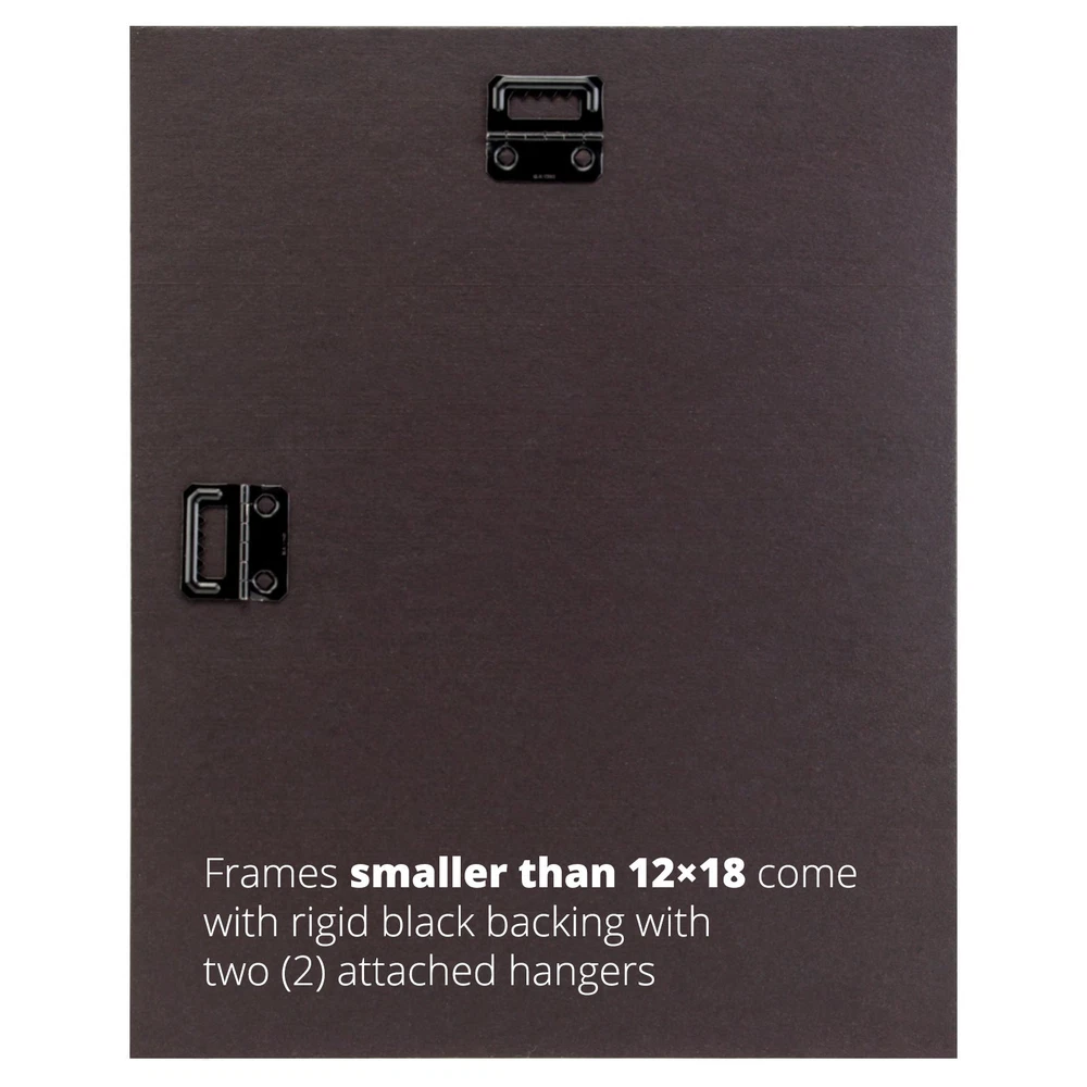 Traditional style; semi-gloss walnut brown stain finish; visible wood grain **COLOR AND GRAIN PATTERN MAY VARY SLIGHTLY WITH EACH FRAME** Frame includes: white matting, glass, rigid black backing and pre-attached stamped hanging hardware Matted frame is designed to display a 5 x 7 inch photo/print/poster (matting will overlap image by .25" on each side). Frame will display a 8 x 12 inch photo/print/poster without the matting (frame lip will overlap image by .25" on each side). Frame moulding is 0.75 inches wide; solid Ash wood construction Frame is designed for WALL HANGING only (hanging hardware allows for portrait or landscape orientation)
