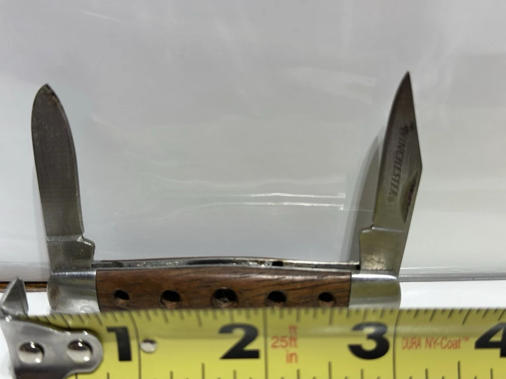 Winchester Knife Lot Lot includes Bowie knife with sheath, knife with sheath. Wooden handle with 2 blades and a 3 blade knife. No nicks or nothing broken. Great for gifts!
