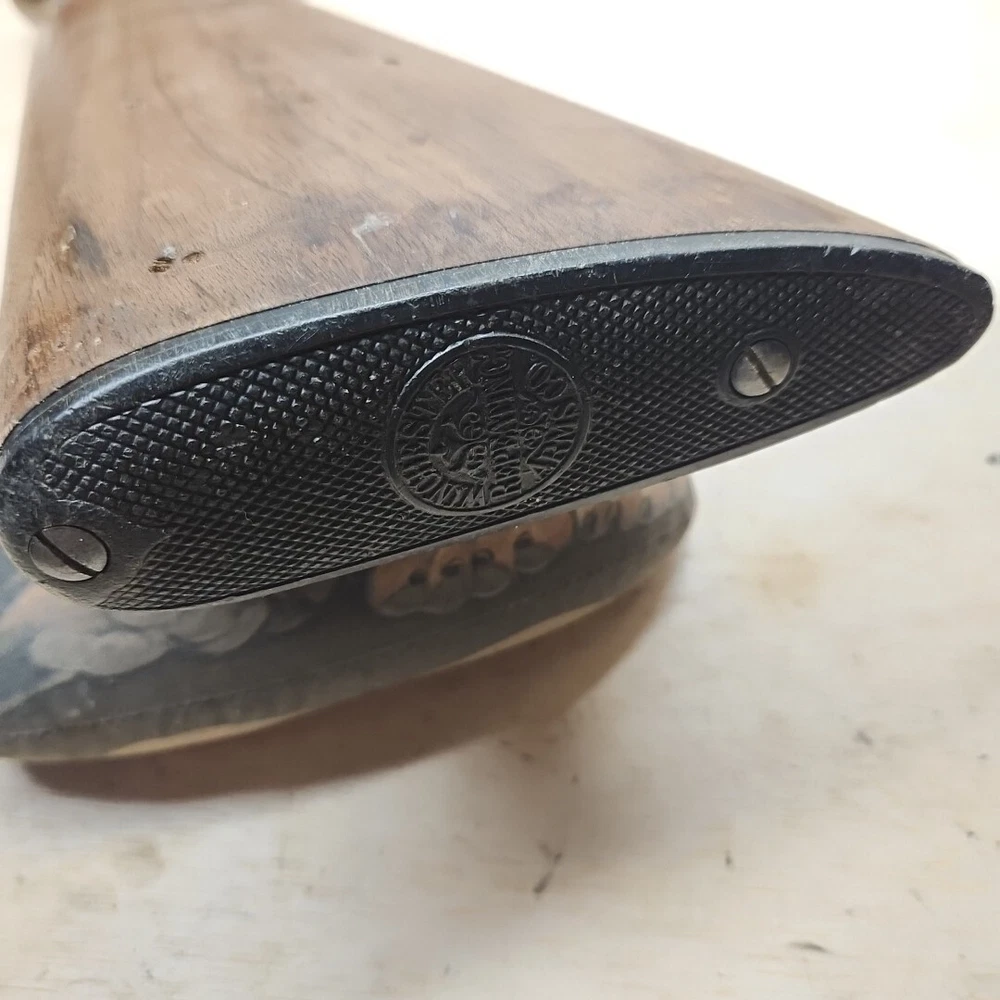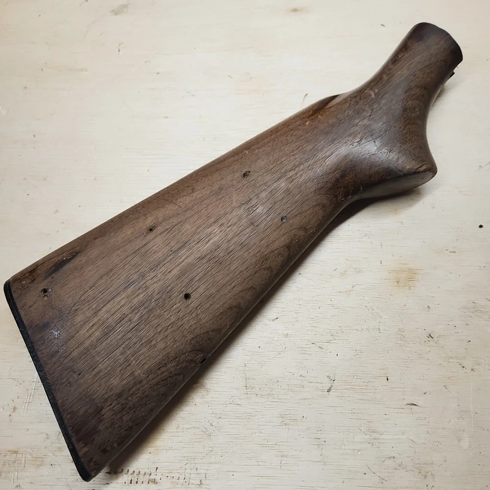 Part: Butt stock and butt plate Make: Winchester Model: 12, 1912 Serial #: N/A Year of Manufacture: N/A Caliber/Gauge: 12 Gauge Barrel: N/A Action: Pump Markings: N/A Finish: Original Overall Condition: Good functional condition, excellent metal to wood fit. Dings and scratches you would expect on working vintage shotgun. It looks like some one drilled some holes on the cheek almost as though a plaque was fitted to it. Review photos carefully.