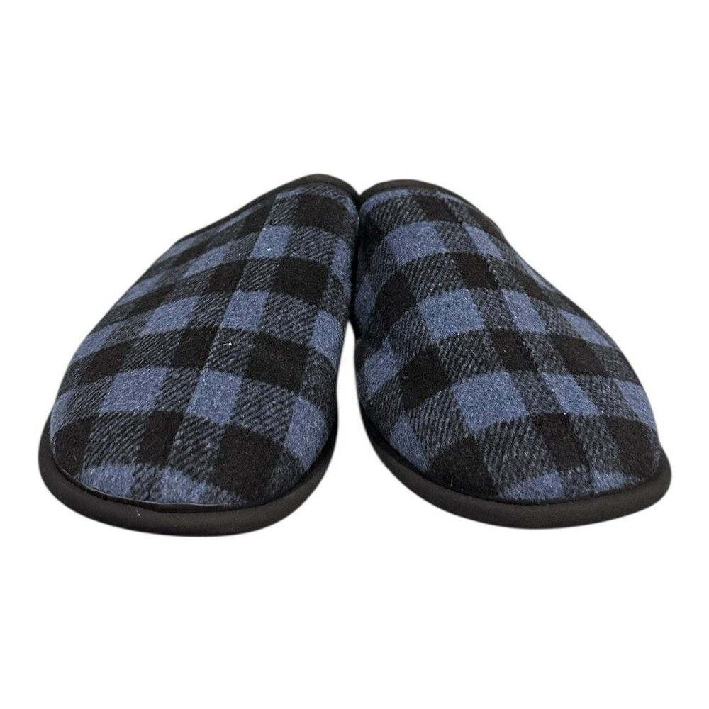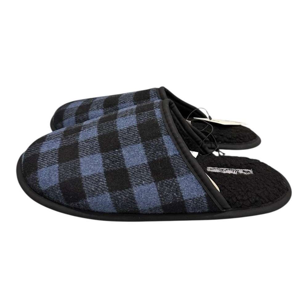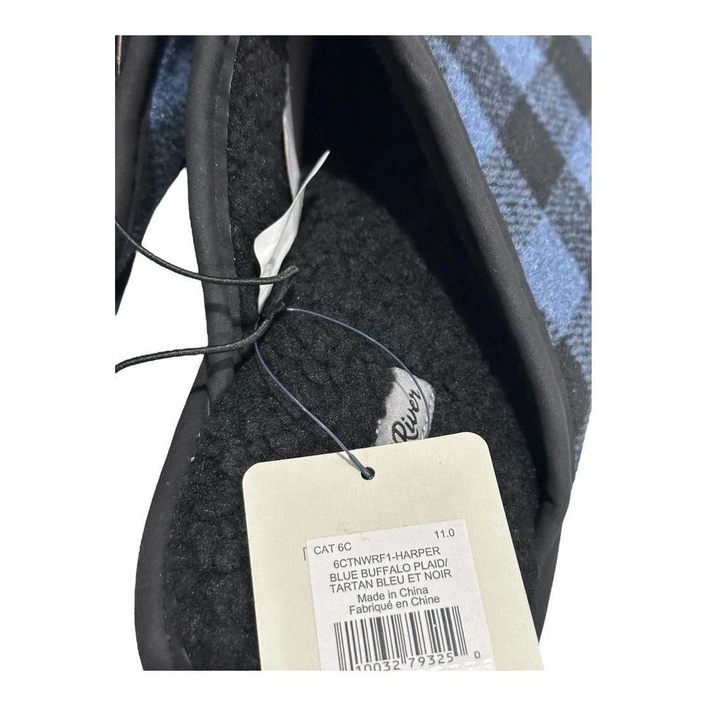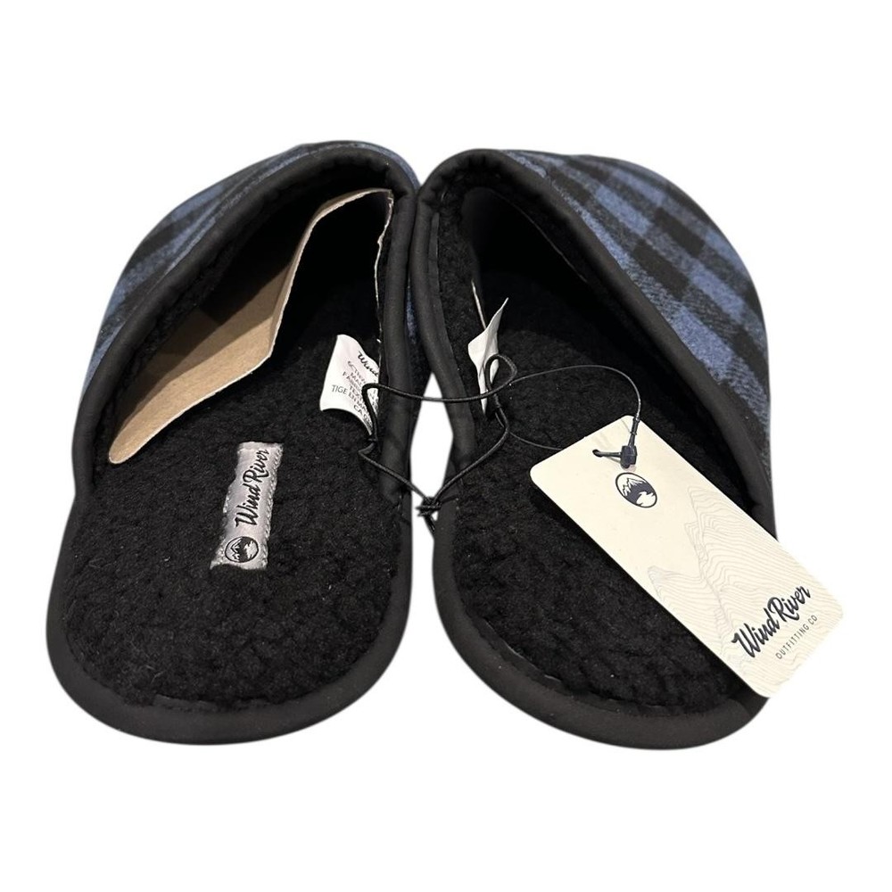Brand: WindRiver Style: Mens slip-on mule house slippers, Harper model designed for casual indoor wear. Color: Blue and black buffalo plaid fabric upper with black trim and black lining. Size: Mens US 11 (tagged 11.0; size 11 molded on outsole). Materials: Fabric upper, soft fleece/faux shearling-style lining and insole, textured rubber outsole, flat heel under 1 inch. Details: Closed round toe, open-back mule design for easy slip-on comfort, cushioned sherpa-style footbed for warmth, lightweight construction, slip-resistant rubber outsoles suitable for indoor floors and quick trips outside. Tags and identifiers: WindRiver woven logo labels on footbeds; retail hang tag attached with style/model code 6CTNWRF1-HARPER and color name "Blue Buffalo Plaid"; made in China; non-vintage, standard width. Special notes: New with tags house shoes intended for cozy everyday lounging and home comfort; original shoebox not included.
