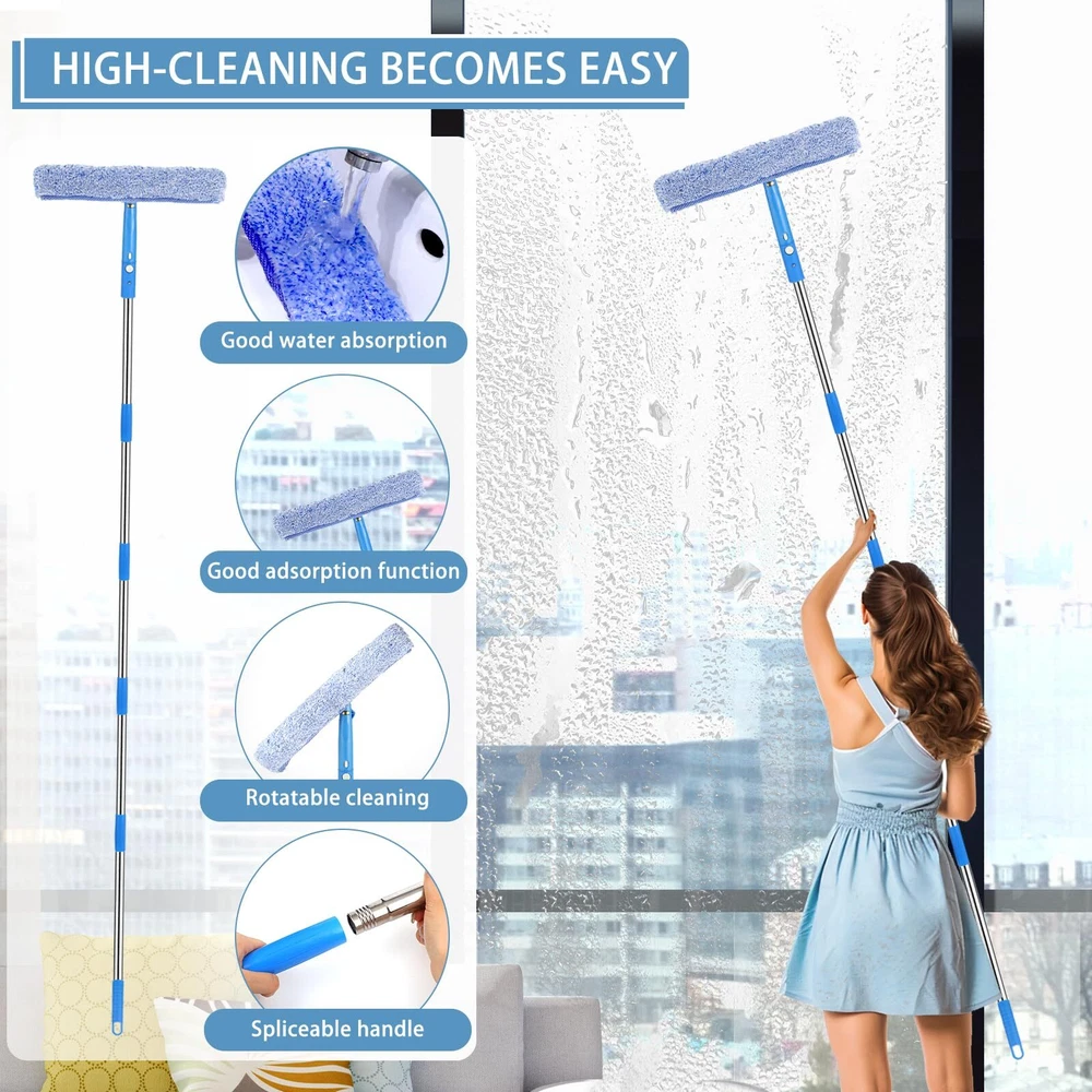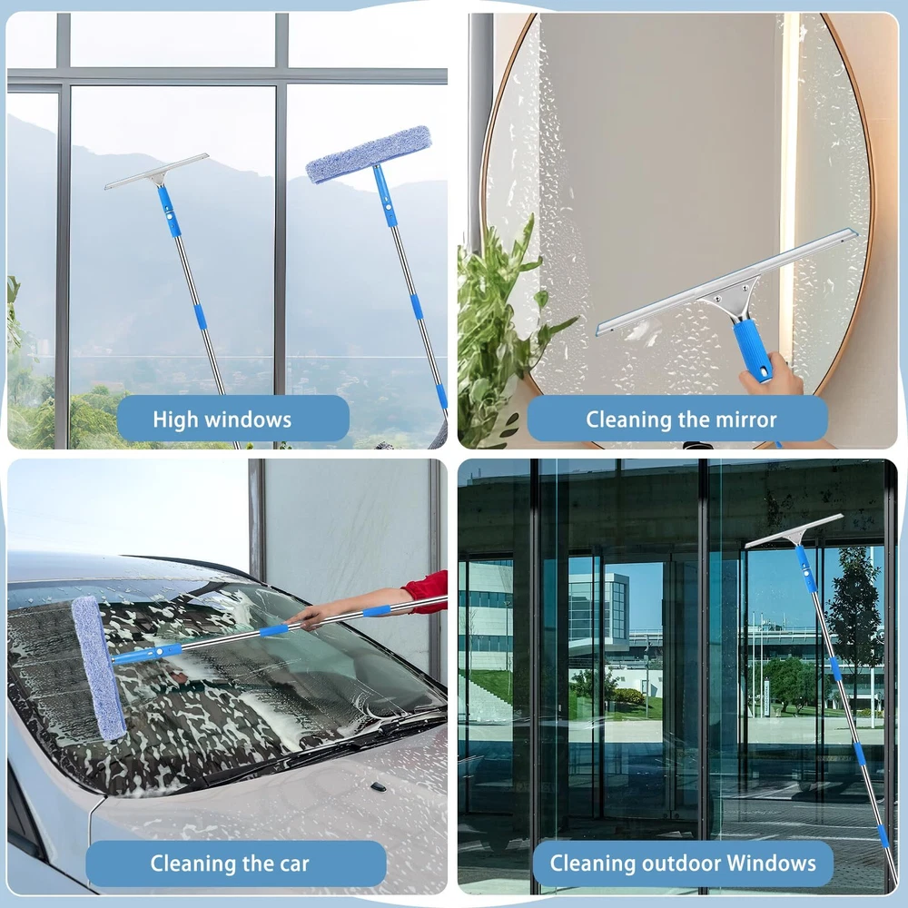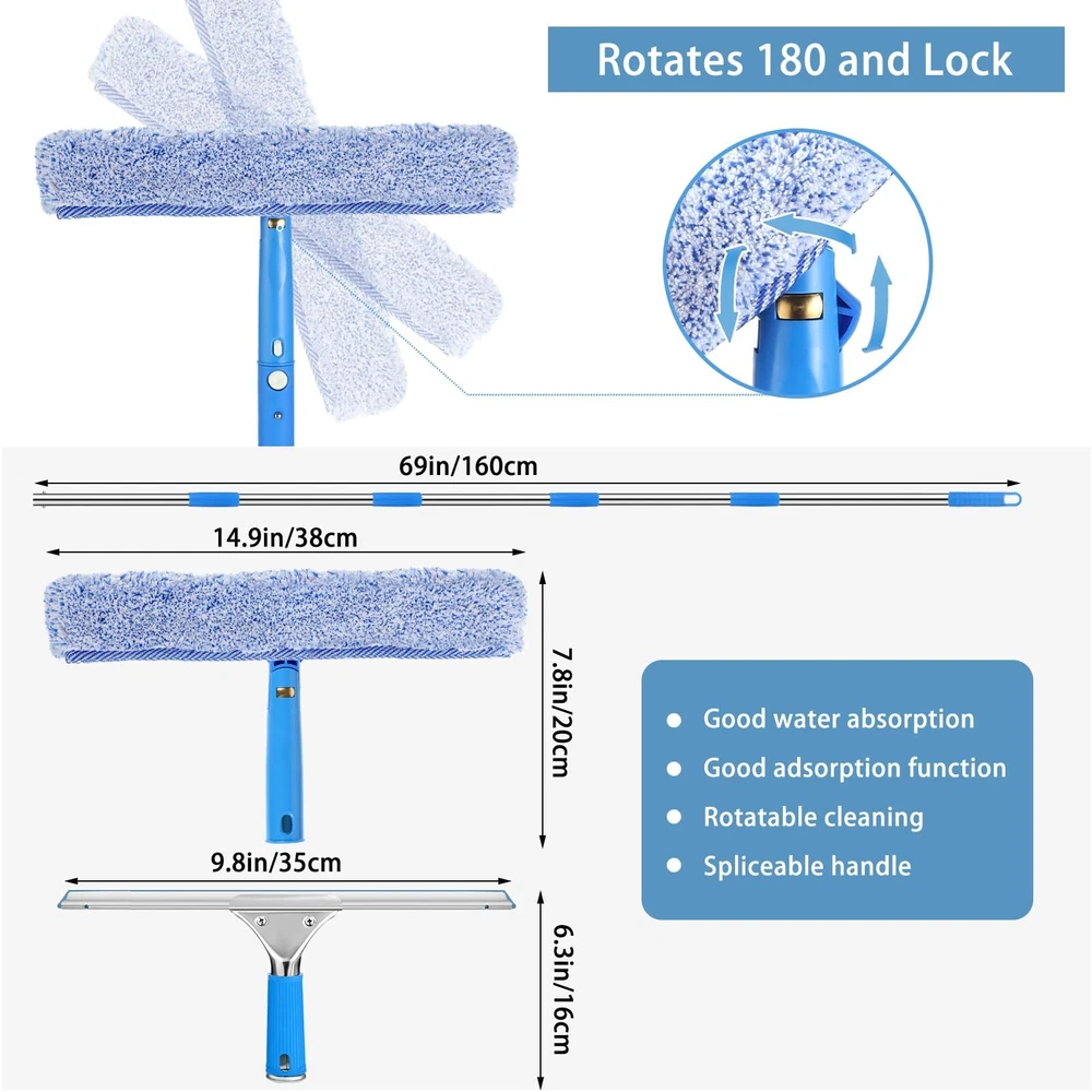 【Window Cleaning Set】Our window cleaning kit contains 1 glass squeegee, 1 microfiber scrubber, 1 microfiber pads and 1 hook. This set is suitable for glass windows or any other smooth surface. The squeegee is made of soft silicone. Long lasting and won't leave marks and scratches on windows. 【Flexible and Adjustable】It can be a handheld window washer or glass squeegee, used to clean dirt on flat surfaces or low parts of windows. It can also be used with a stainless steel retractable handle. The handle can be extended up to 63 inches to help you safely wash tall indoor and outdoor windows without the need for a ladder. 【180° Rotation Design】The microfiber scrubber can rotate 180 degrees with just one click to evenly apply the cleaner on the window glass, which is flexible and convenient. It can solve the problem of uneven application of detergent and difficulty in covering it, bringing great convenience to cleaning work. 【Convenient to Store】The matching set comes with hooks, you can hang the window squeegee washing kit in every corner which is convenient and quick, saving a lot of space. 【Wide Range of Uses】The window squeegee paired with the microfiber scrubber can effectively remove water, scale and soap scum from smooth surfaces such as shower glass doors, windows, tiles, mirrors and car glass.