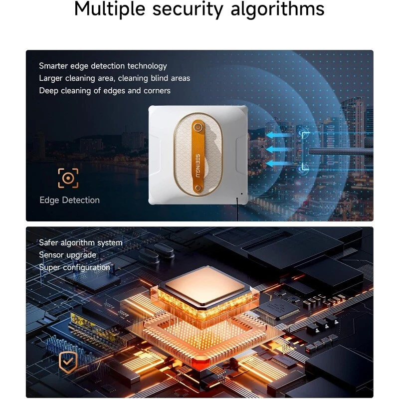 About this item 【6000Pa High Power Suction】6000Pa is the maximum suction power this window cleaning robot can provide, which is enough to surpass many similar products. It is equivalent to 45N of manual pressure by hand, which is very efficient and sufficient for cleaning glass. 【High Precision Detection & AI Algorithm】Even frameless glasses cleaning is nothing difficult due to ultra-advanced Optocoupler edge detection technology, and Intelligent frequency conversion will automatically adjust the suction power to help crossing small gap. 【AI Nevigation for 5 Cleaning Paths】When the window cleaning robot is turned on, Z-shaped cleaning is started by default. The remote control can switch to N-shaped edge cleaning mode. If you encounter glass with relatively large stains you can use N+Z cleaning mode. It is also equipped with left and right area cleaning to help you better clean the stubborn stains areas of the glass. 【Intelligent Water Spraying System】Our Window Cleaning Robot features a 150ml water tank for efficient cleaning, controlled by remote. With a speed of 3.86 minutes per square meter, ensuring 3.6 hours of uninterrupted spraying. 【Highest safety】This window robot cleaner is designed with a built-in UPS (uninterruptible power supply), allowing the window cleaner robot to continue operating for up to 30 minutes during a power outage. The window cleaner robot also includes a 5m high-strength safety rope supporting up to 50kg, ensuring safe cleaning for high-rise windows.