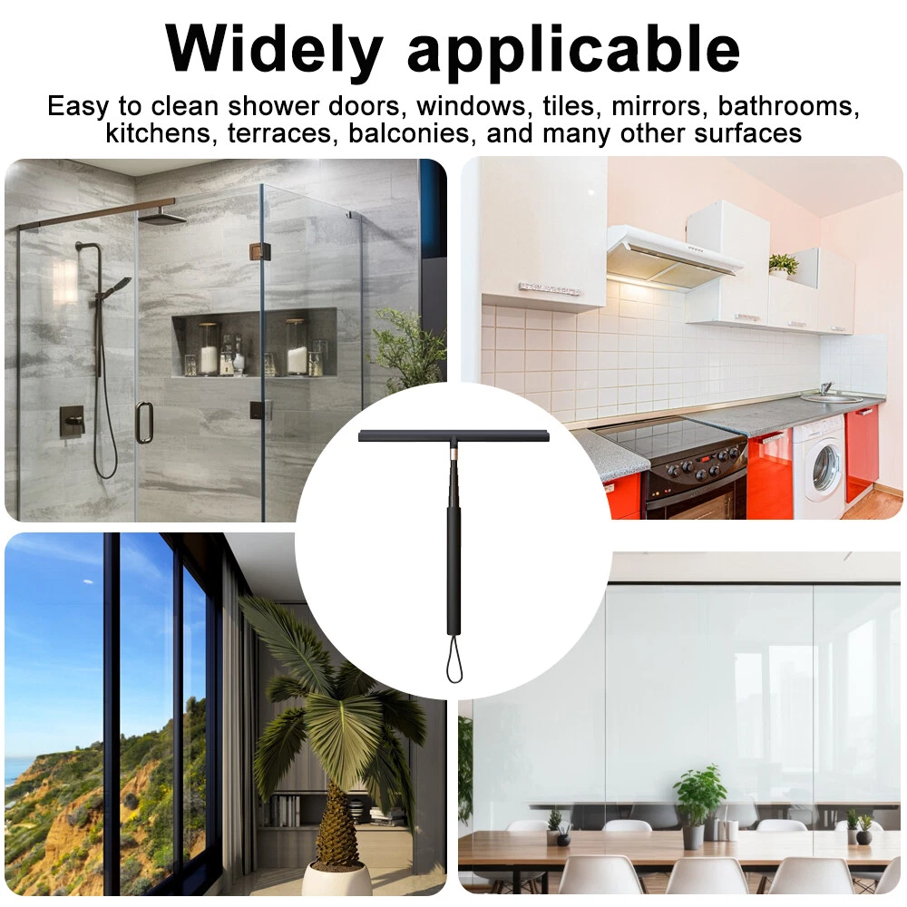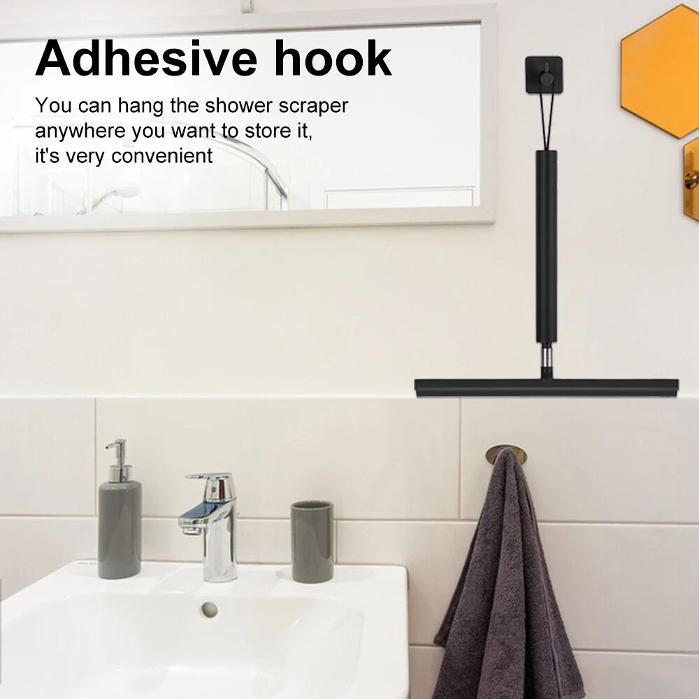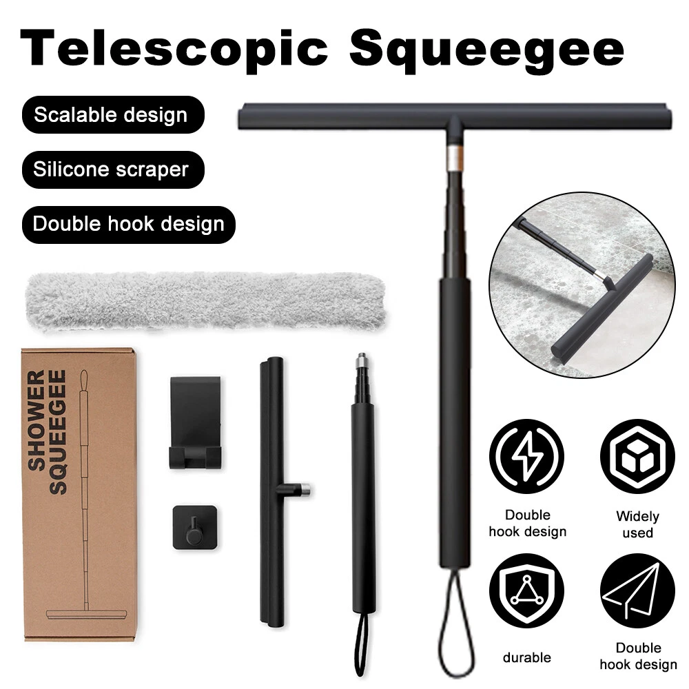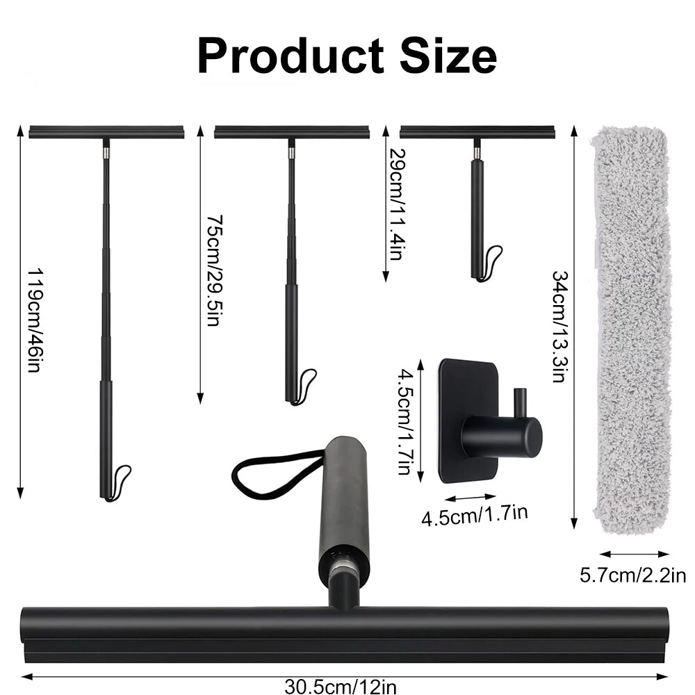Features: 1. Telescopic design: this long handle shower squeegee can be shortened to a minimum of 11.4 inches (approx. 29 cm) and extended to a maximum of 46 inches (approx. 119 cm), allowing you to easily clean high-rise windows and floors without bending over, providing you with optimal control and comfort for your daily cleaning tasks. 2. Dual hook design: the product comes with 1 silicone hook and 1 adhesive hook, no drilling required, you can hang the shower squeegee wherever you want to store it conveniently. 3. Easy to use: the squeegee of this glass cleaning tool is made of silicone, which can easily eliminate water and soap stains and enhance your cleaning experience. 4. Durable and long-lasting: this bathroom squeegee is made of high-quality materials that are built to last. The sturdy construction ensures that it can withstand daily use and remain in perfect working condition for years to come. 5. Multi-purpose Cleaning: This squeegee is suitable for a variety of cleaning tasks and can easily clean shower doors, windows, tiles, mirrors, bathrooms, kitchens, patios, balconies and many other surfaces. Specifications: Material: rubber Telescopic range: 29cm-119cm Product size: 29*30.5*4cm Product features: telescopic design, double hooks equipped with Application: shower doors, windows, tiles, mirrors, bathrooms, kitchens, terraces, balconies and many other flat surfaces to clean. Package List: 1*Scraper head 1*Telescopic pole 1*Square hook 1*Shaped hook 1*Cloth cover 1*Packaging box On Nov 21, 2024 at 03:02:19 PST, seller added the following information:
