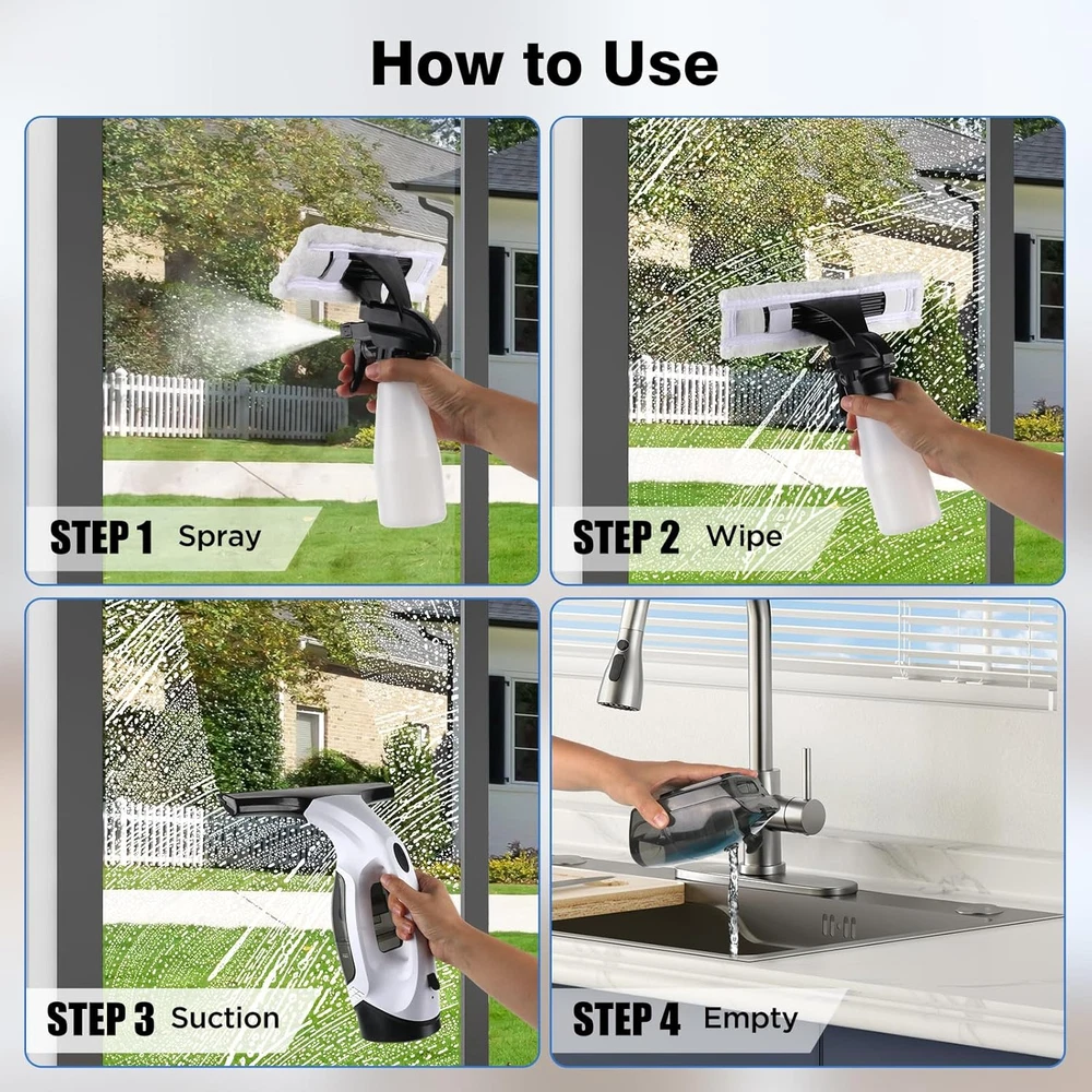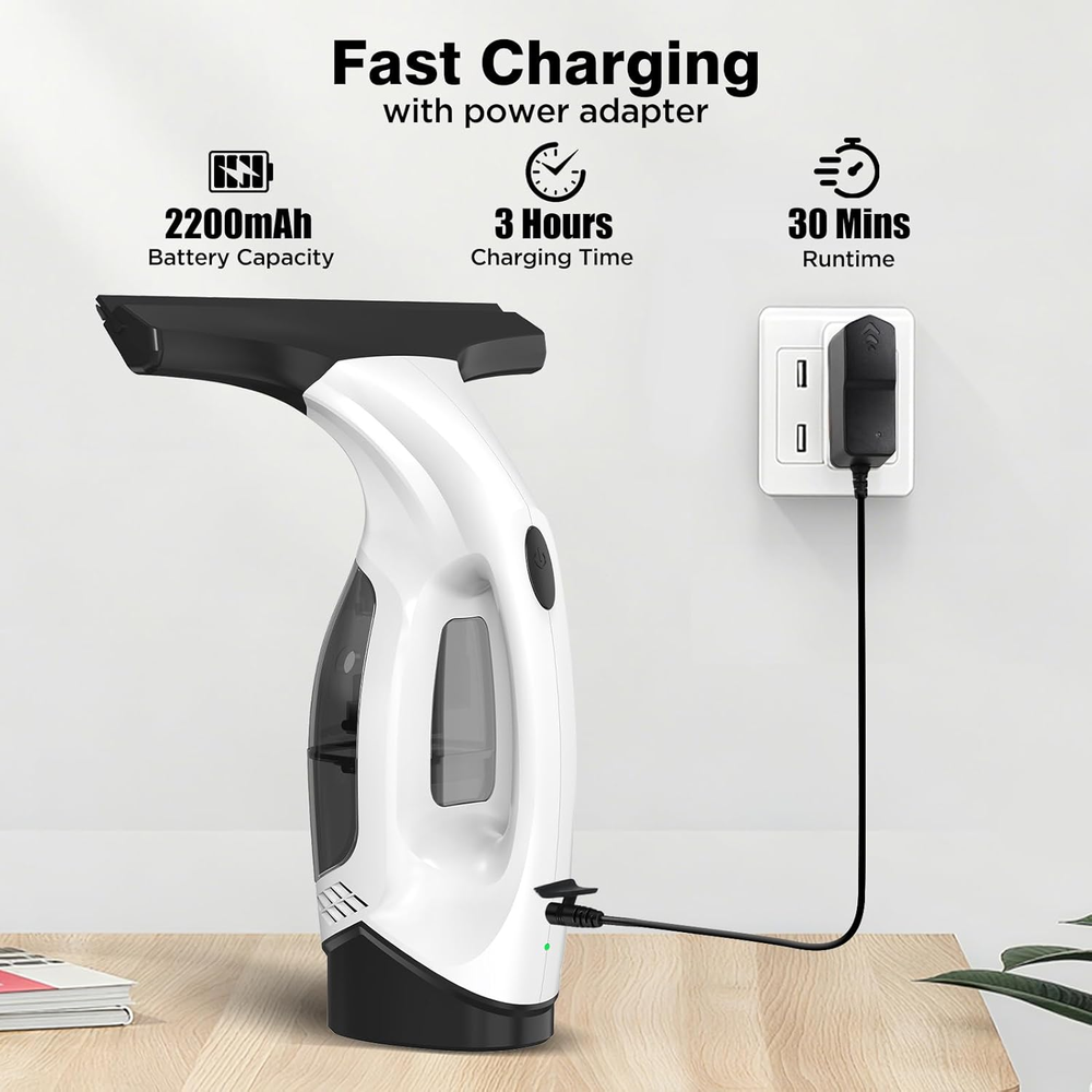 2000Pa Strong Suction & Dry in Seconds: Experience a streak-free shine with our ZRHI cordless window vacuum squeegee. The powerful 2000Pa suction instantly removes water and cleaning solution, leaving your windows, mirrors, and glass surfaces dry and crystal clear in just one pass. 2200mAh Long-Lasting Battery: Enjoy the convenience of a truly cordless electric window cleaner tool. The built-in 2200mAh rechargeable battery provides ample power for your entire cleaning session, allowing you to tackle multiple rooms without the hassle of frequent recharging. 150mL Detachable Tank: The ZRHI electric window washer squeegee features a transparent 150mL water tank that is easy to detach and empty. Its generous capacity means less interruption for emptying, making your cleaning of large surface areas like shower doors or big windows much more efficient. 280mm Extra-Wide Squeegee Blade: Cover more surface area with every swipe! The extra-wide 280mm suction head on this vacuum window squeegee ensures faster and more efficient cleaning on large glass panels, significantly reducing your overall cleaning time and effort. Versatile for Multi-Surface Cleaning: This cordless window cleaning kit is your all-in-one solution for spotless smooth surfaces. It works perfectly on bathroom glass doors, windows, kitchen countertops, tiles, and even car windshields, eliminating the need for multiple cleaning tools. Product description Can I use it on surfaces other than windows, like shower glass or tiles? Absolutely! This is a versatile tool perfect for cleaning shower glass, glass tabletops, car windows, and even ceramic or marble tiles. It leaves all smooth, non-porous surfaces sparkling clean and dry. Why does the window vacuum cleaner leak? The machine is most likely leaking because the water level in the dirty water tank has exceeded the MAX line. Please ensure you empty the tank before the water reaches this maximum indicator line to prevent leakage and ensure optimal performance. Does it leave any streaks or watermarks after use? No! Our squeegee features a high-precision rubber blade that glides smoothly to remove all water. If stripes appear due to the bending of the rubber scraper, the scraper can be pulled out, flipped over and reassembled for reuse. (Replace if worn.) How do I clean and maintain the suction head to prevent clogs? Maintenance is simple. After use, detach the suction head and rinse it with clean water to remove any debris. Ensure it's completely dry before storing. We recommend checking and cleaning it regularly to maintain optimal suction power. Is it complicated to operate? Not at all. Operation is straightforward with a simple one-button start. There are no complicated settings or tools required.