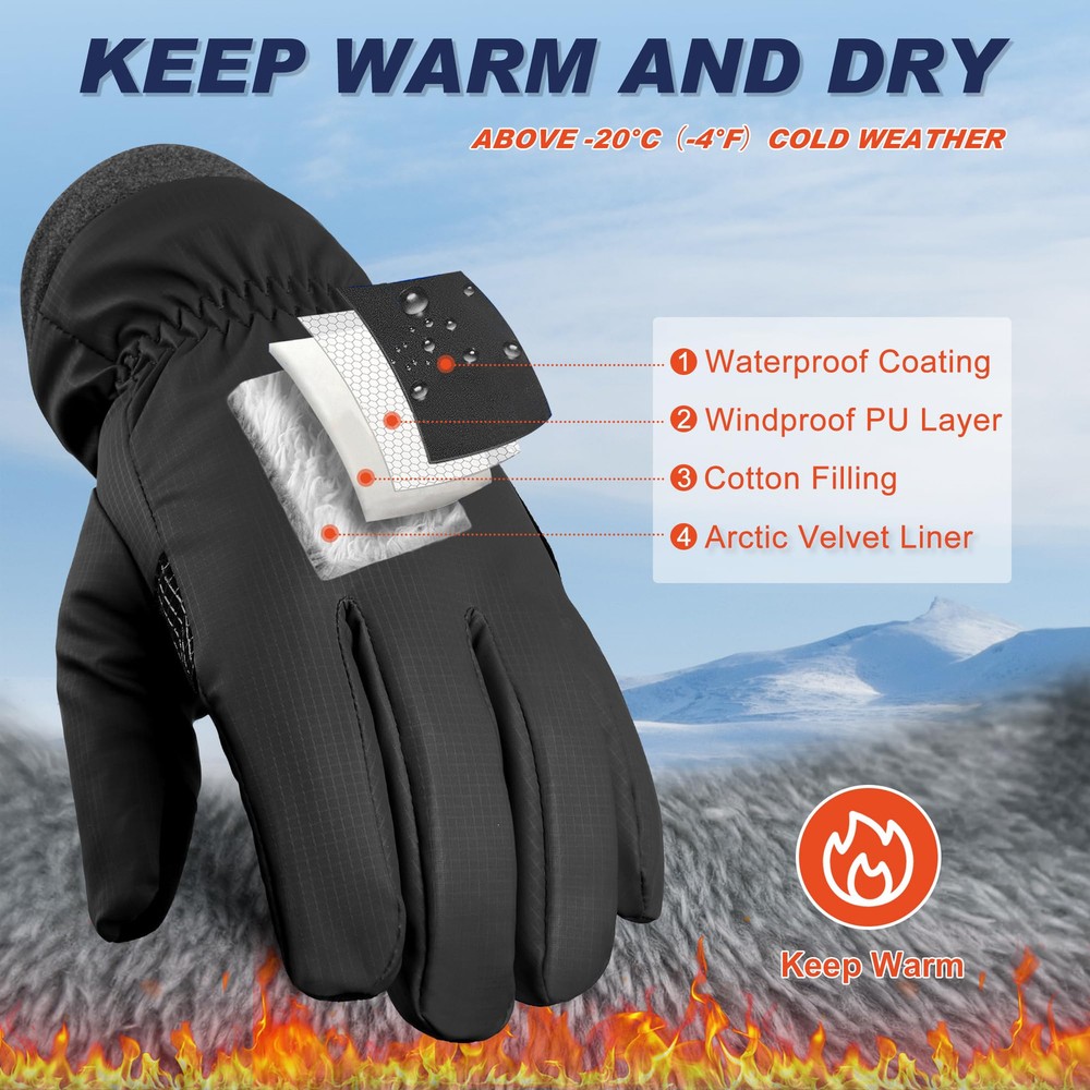 Windproof: Winter gloves for cold weather, adjustable elastic cuffs block wind and snow, keeping your hands warm and dry in cold weather; winter gloves men are perfect for walking, running, driving, cycling, skiing, snowboarding Keep Warm and Comfortable: Crafted with premium PU exterior, lined with a cozy grey arctic fleece lining and soft cotton filling, our windproof winter ski gloves for men women deliver exceptional warmth down to -4℉(-20°C), ensuring cozy hands all winter season long Non-Slip Silicone Palm: Winter snow gloves for women feature a non-slip silicone palm for excellent grip and control; Wear mens gloves winter to better protect your hands while driving, shoveling snow, cycling, skiing, camping, hiking or other outdoor activities in cold weather 3-Fingers Touchscreen: The thumb, index and middle fingers of winter gloves can touch and slide the screen, achieve seamless connection, suitable for all touch screen devices; Wearing winter gloves can easily answer calls, navigate maps or check messages without exposing your hands to the cold Easy to Carry and Store: The warm winter gloves for cold weather come with a convenient lock clip that can be securely attached, preventing loss and convenient for you to store and carry the winter gloves women, perfect for daily activities or going out Widely Use: The ski gloves men women are 2 colors and 3 sizes for choice from M to XL and you can check it in our size chart before purchase; Enjoy the excellent experience with our winter gloves in cold weathers while skiing, snowboarding, cycling, running, dog walking, hiking, climbing, driving, etc.