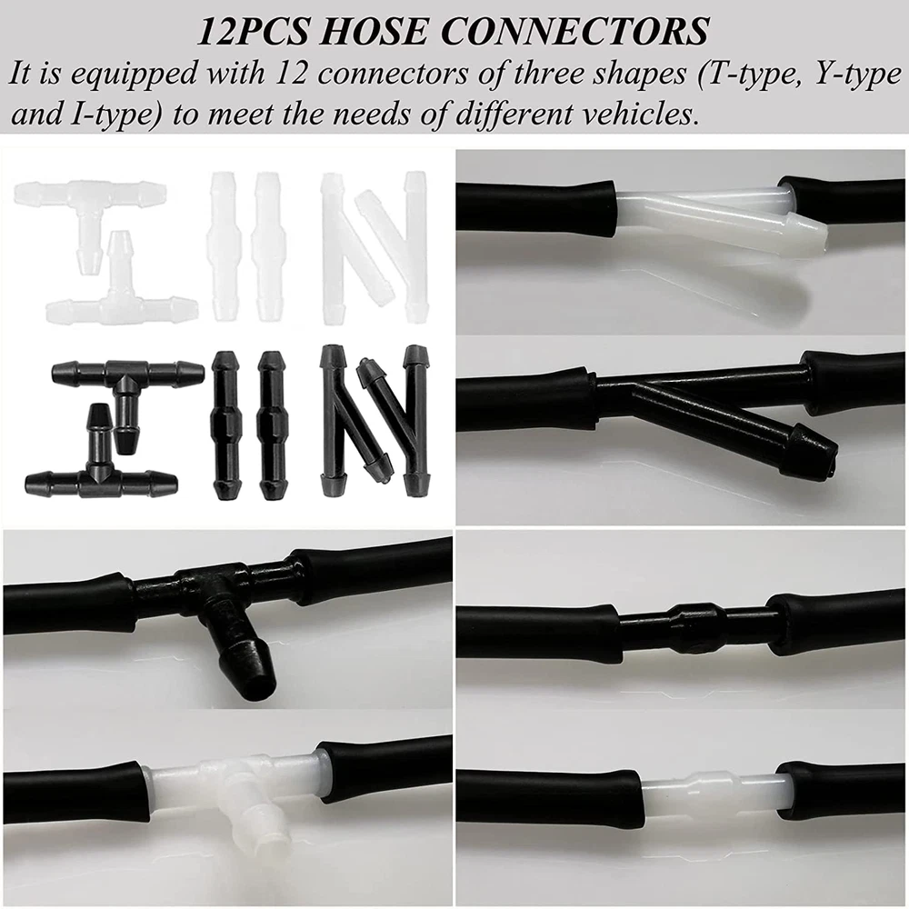 windshield washer hose repair kit -- The washer hose kit is easy to replace and install. Windshield washer hose kits help you easily and quickly replace aging hoses and properly connect your car's water pump to the windshield nozzle to ensure smooth water spraying and glass cleaning. You can replace the new windshield wiper hose repair kit by yourself to save money for your loved automotive car. Premium windshield washer Hose Kit -- Our windshield washer nozzle kit is made of high-quality rubber, which is soft and elastic, strong and robust for long term use. When you feel that your old windshield washer hose or nozzle is not workable for your car to clean the car glass, you can use our such premium windshield wiper hose kit to replace your old washer fluid hose conveniently. Compatibility -- This windshield wiper hose repair kit is compatible for most windshield washer hose and nozzles, this is because the windshield washer hose connector is universal auto parts for cleaning car glass. So, the windshield washer hose and nozzles kit is widely used in cars, SUVs, trucks, etc. Moreover, it is easy to connect car water pumps and nozzles by yourself. By this way, this windshield washer hose connector kit will give you a clear view for your car. Universal Washer Fluid Hose -- As fo the windshield repair kit, windshield washer hose is four meters long, and you can cut washer fluid hose to fit your actual needs. Also, this windshield wiper hose repair kit is included three shapes (T type; Y type; I type) of connectors to meet the needs of different cars. Never spend much money on the replacement of the windshield washer nozzle kit. Windshield Washer Hose Repair Kit -- You will get 1 x 4M windshield washer hose + 12 x windshield wiper hose connectors (including three types: 4 x T type; 4 x Y type; 4 x I type). Dimensions: Washer hose length is 4 meter/157.5 inch, inner diameter is 4.3 mm/0.17 inch, outer diameter is 6.8 mm/0.27 inch. If you have any questions about the product, please feel free to contact us and we will try our best to solve the problem. This is windshield washer hose connector kit. Product Description Universal Windshield Washer Nozzle Fluid Hose Kit, Suitable for Most Car Windshield Washer Nozzle, Connect Car Water Pump with Windshield Nozzle Features: The windshield washer hose kit is made of high-quality rubber material, which is soft, flexible, robust and can be used for a long time. Windshield washer hose kits help you replace aging hoses to keep the water spraying and glass cleaning running smoothly. This windshield wiper hose repair kit is suitable for most windshield washer nozzles. Compatible with cars, SUVs, trucks and more. Windshield washer fluid hoses that are long enough (4 meters long) to be cut as needed. The automotive replacement windshield washer hose kit is easy to replace and install. Three shapes (T-type, Y-type, I-type) of connectors are available to meet the needs of different cars. Windshield Washer Hose Kit with 4 Meter Washer Fluid Hose & 12 Pcs Hose Connectors Specifications: Material: High Quality Rubber T-type Connectors Size: 3.5 x 1.5 x 0.25 cm / 1.37 x 0.6 x 0.1 inch Y-type Connectors Size: 3.5 x 0.25 cm / 1.37 x 0.1 inch I-type Connectors Size: 3.5 x 0.25 cm / 1.37 x 0.1 inch Hose Size: Total length is 4 meter / 157.5 inch; Inner diameter is 4.3 mm / 0.17 inch; Outer diameter is 6.8 mm / 0.27 inch Package Included: 1 x 4M windshield washer hose + 12 x windshield wiper hose connectors I-type Connectors Y-type Connectors T-type Connectors