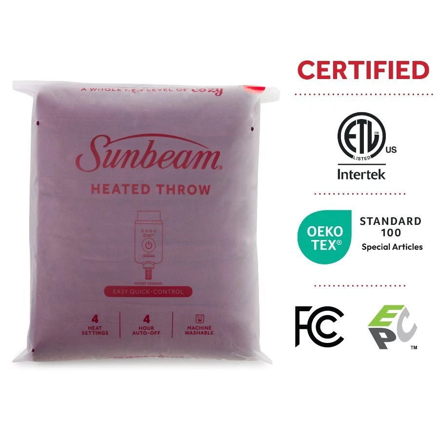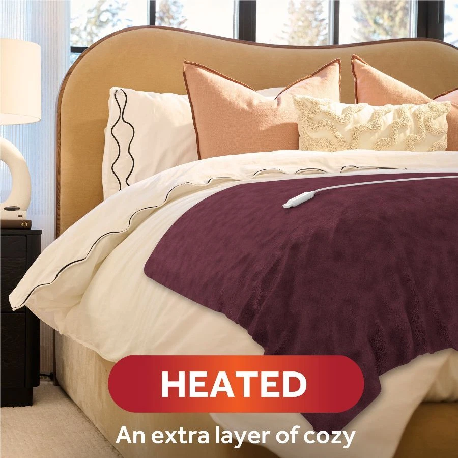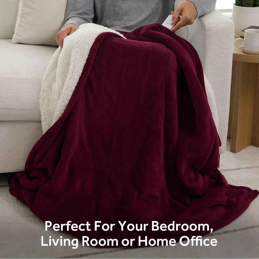 Sunbeam Windsor Wine Microplush Sherpa/Faux Shearling Heated Throw wraps you in luxurious warmth, perfect for those chilly cold nights. Imagine sinking into the rich and ultra-cozy microplush with reverse Sherpa/Faux Shearling fabric, keeping you toasty and comfortable while you relax. The stylish 50" x 60" electric blanket makes a great accessory while relaxing on the couch, bed or your favourite chair and the Windsor Wine color adds a stylish to any décor. This throw features an easy-to-use push-button controller with 4 adjustable heat settings, so you can find your perfect temperature. The 4-hour auto shut-off function ensures added peace of mind. Premium heated wires are equipped with advanced technology to ensure continuous even heat distribution. When it’s time to clean, simply detach the controller from the throw and place in the washing machine and dryer for easy care. It stays silky soft wash after wash. Experience the ultimate gift of warmth with a Sunbeam heated electric throw for you and your family and friends. On Dec 26, 2024 at 18:47:14 PST, seller added the following information: