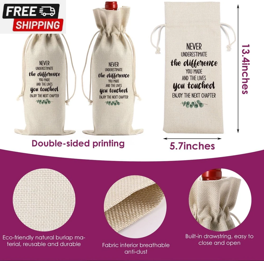 Store New Arrivals Add to Favorite View Feedback Contact Wine Bag, Coworker Leaving Gifts for Women Men, Goodbye Gifts for Coworkers, Going Away Gifts for Coworkers Women, Farewell Gifts for Coworkers, Moving Away Gifts for Friends, Leaving Job Description Item Weight 1.27 ounces Product Dimensions 5.6 x 0.1 x 12.9 inches 【New Chapter Wine Gift Bag】Our wine bag is made of high-quality burlap, which is sturdy and not easy to grind. It measures 5.6×12.9 inches, which is a good size to hold a regular-sized bottle of 750ml wine. Put the bottle in it, and our wine bag can fit well and protect the bottle. At the same time, it has a drawstring design, which is convenient for taking and putting the bottle in the wine bag, and it is also convenient to carry. 【Going Away Gifts for Friends】This wine bag is printed with heartwarming blessings, which can congratulate people on starting a new chapter in their lives. It is very suitable as going away gifts, moving away gifts, farewell gifts, goodbye gifts for friends who are about to leave, which will bring them surprises. 【Farewell Gifts for Coworkers】With a special message of congratulations and good wishes, this wine bag is the perfect going away gift, goodbye gifts for coworkers, coworker leaving gifts, leaving job gifts for any female or male boss friend starting a new job! 【New Beginning Gifts for Women】New Beginning Gift Wine Bags, Gifts for leaving colleagues, farewell gifts, new life gift, wedding gift, divorce gift, graduation gift, moving away gifts wine bags, new chapter party decorations. Wine bags carry special messages, whether it is a new life, parting or various special holidays, they are the perfect choice for gifts. 【Retirement Gifts for Women】Our wine bags can be used as an interesting farewell gift for colleagues and bosses who are about to leave, wishing them a happy new chapter. Our wine bag is printed with "Never underestimate the difference you made...", which is perfect for anyone who is about to start a new journey in life. It can be used as a farewell gift, retirement gift, wedding gift, divorce gift, moving gift, etc., which can bring surprises to the recipient. Our wine bag is made of burlap and measures 5.6×12.9 inches. It can hold a 750ml bottle of wine well, and can also be used to carry water glasses and other items, while being lightweight and portable. ABOUT US We offer the best prices around on high quality products. Our E-store includes media such as books, movies, music and games while offering electronics, toys, sporting apparel, clothing, tools, general home, garden items and more. SHIPPING We are always working hard to ensure your package arrives as soon as possible. Please understand that some factors like weather, high postal traffic, and the performance of shipping companies are outside of our control. We offer free shipping to the lower 48 states and ship within 2 business days of payment, usually sooner. We do not accept P.O. Boxes. Please provide a physical address. For shipping outside of the continental USA, we only use eBay's Global Shipping Program.The item is shipped to KY and then sent to the rest of the world. International customers are responsible for all duties and taxes. Continue to 'check out' to calculate costs for shipping the item to your country. Messages regarding eBay's Global Shipping Program MUST be directed at eBay EXCLUSIVELY. RETURNS We offer a 30-Day Return Policy on items in which you are not completely satisfied with. You have the option of a full-refund or an exchange of the item. No returns are available on items shipped outside of the USA. PAYMENT We accept PayPal. CONTACT US This page content is yet to come Please ad us to your favorite seller and visit again later Thank You CUSTOMER SATISFACTION We try our very best to make sure every customer is completely satisfied. If there's a problem, message us! We're happy to help. WE ACCEPT https://www.ebay.com/str/ysrastore